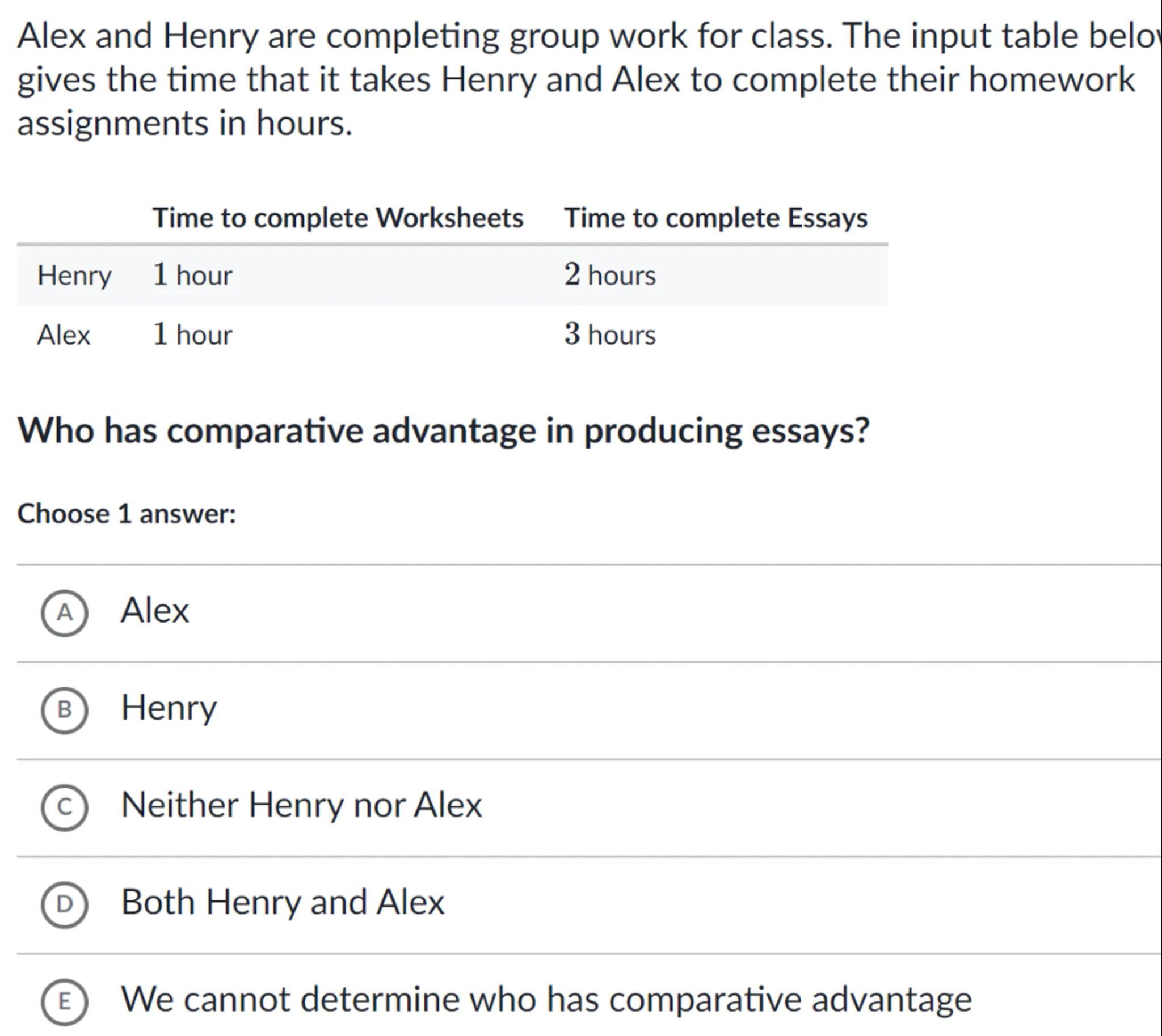 Alex and Henry are completing group work for class. The input table belo gives the time that it takes Henry and Alex to complete their homework assignments in hours.