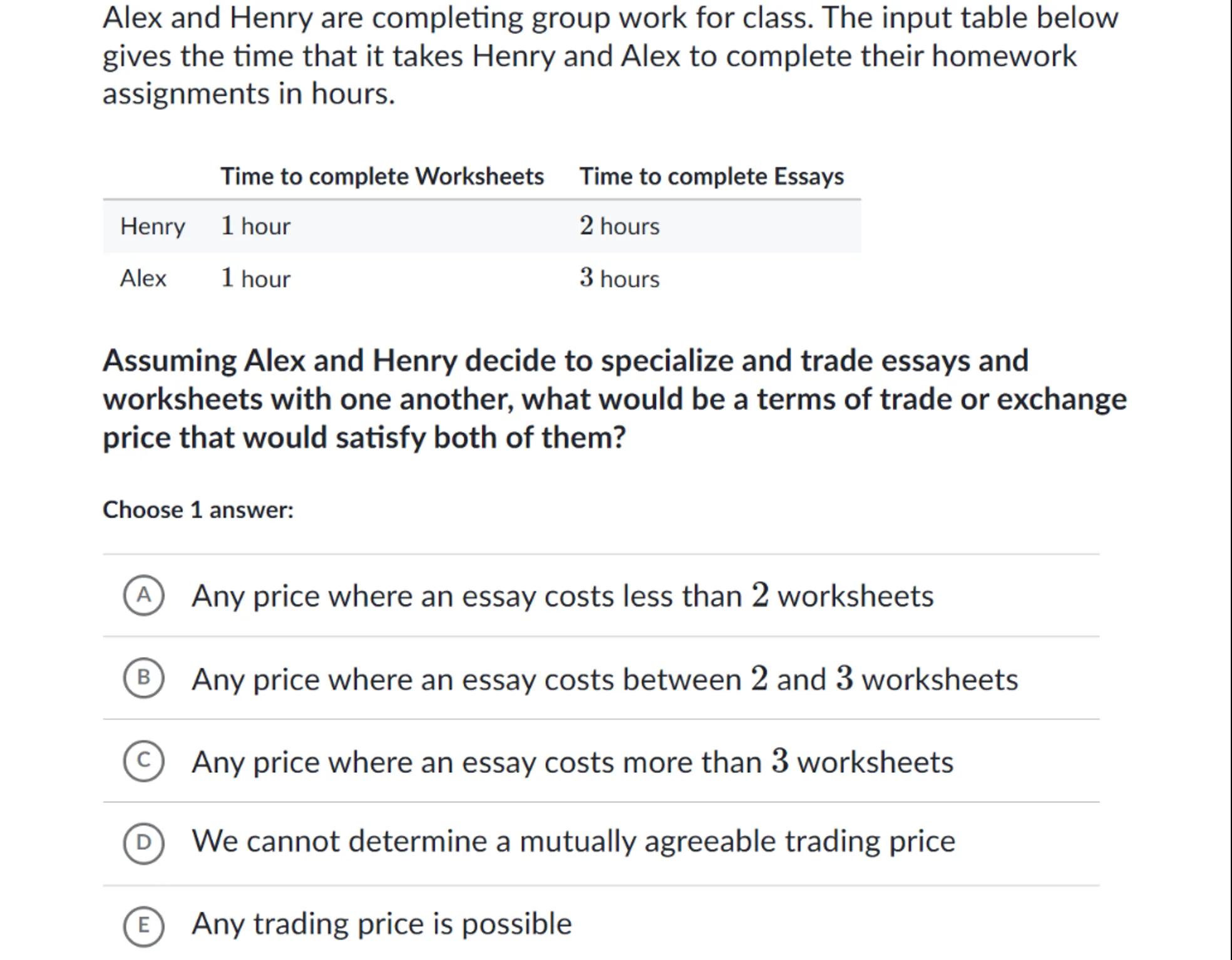 Assuming Alex and Henry decide to specialize and trade essays and worksheets with one another, what would be a terms of trade or exchange price that would satisfy both of them?
