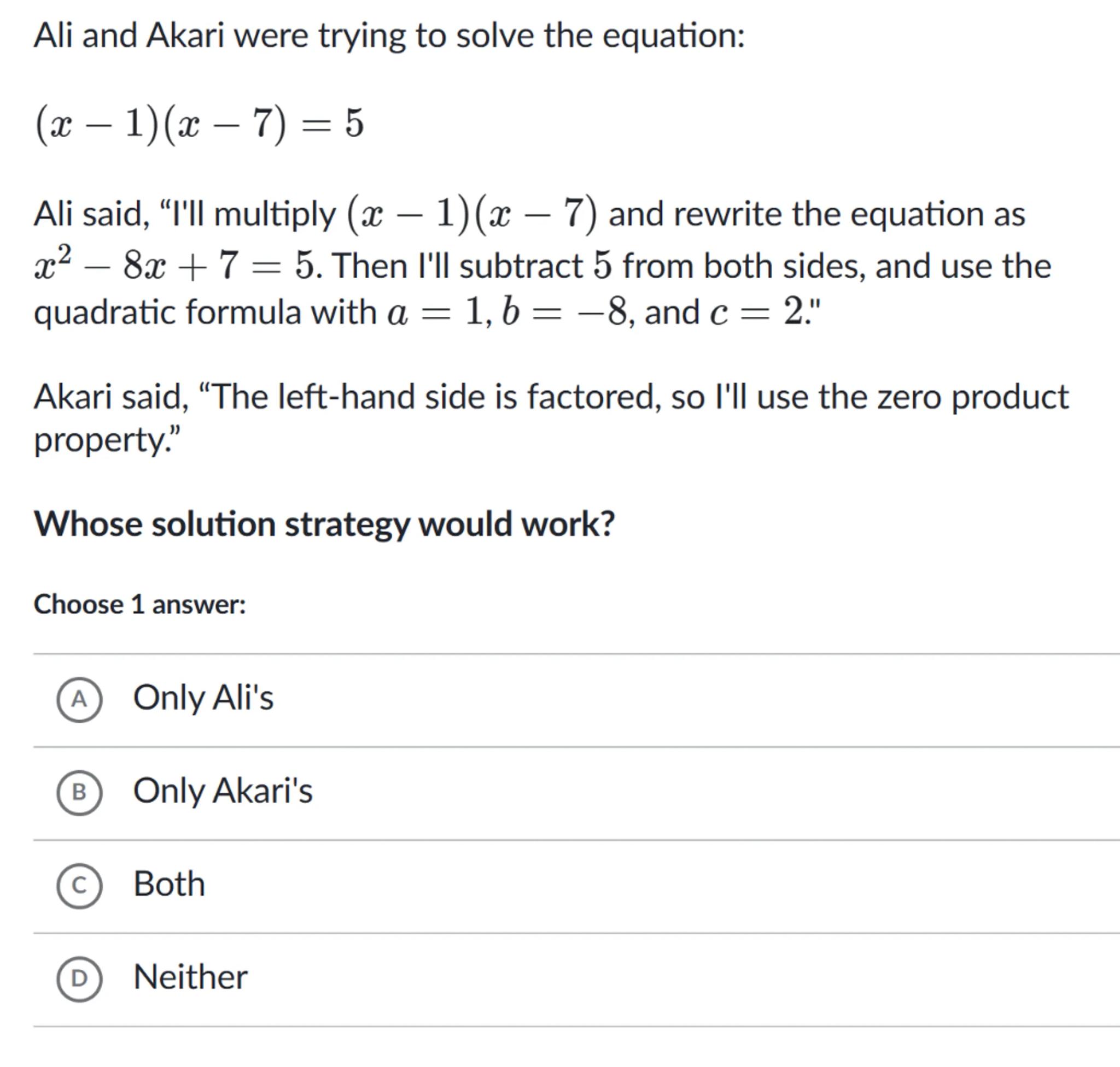 Akari said, "The left-hand side is factored, so I'll use the zero product property."