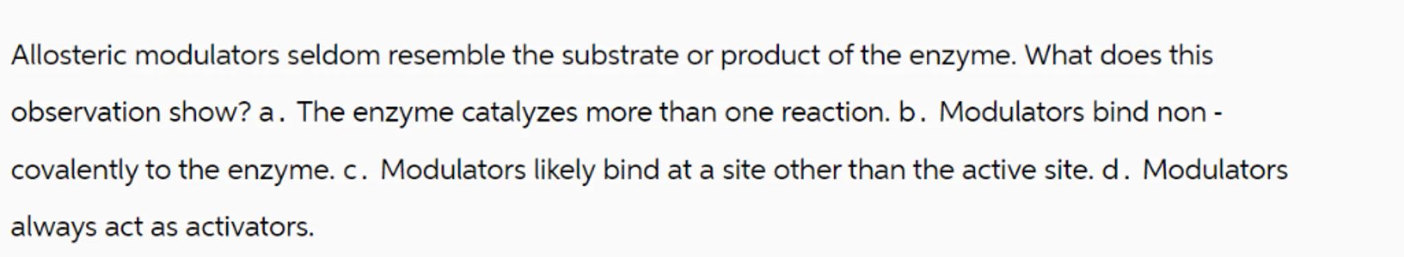 Allosteric modulators seldom resemble the substrate or product of the enzyme. What does this observation show? a. The enzyme catalyzes more than one reaction. b. Modulators bind non covalently to the enzyme. c. Modulators likely bind at a site other than the active site. d. Modulators always act as activators.