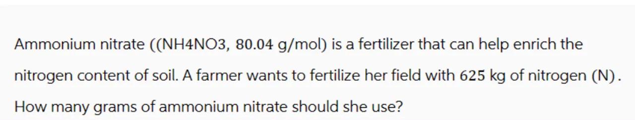 Ammonium nitrate is a fertilizer that can help enrich the nitrogen content of soil. A farmer wants to fertilize her field with of nitrogen (N). How many grams of ammonium nitrate should she use?