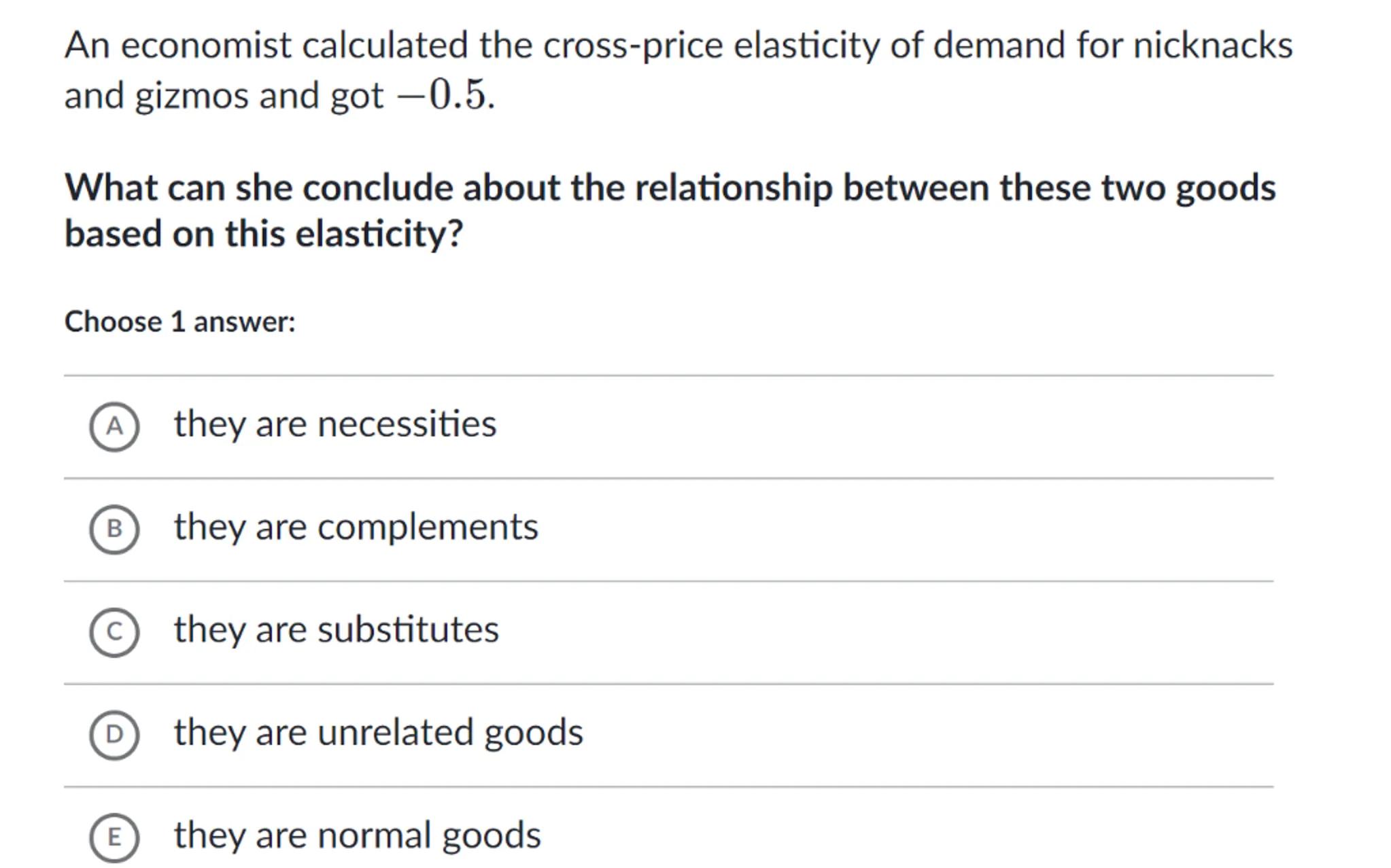 An economist calculated the cross-price elasticity of demand for nicknacks and gizmos and got -0.5 .