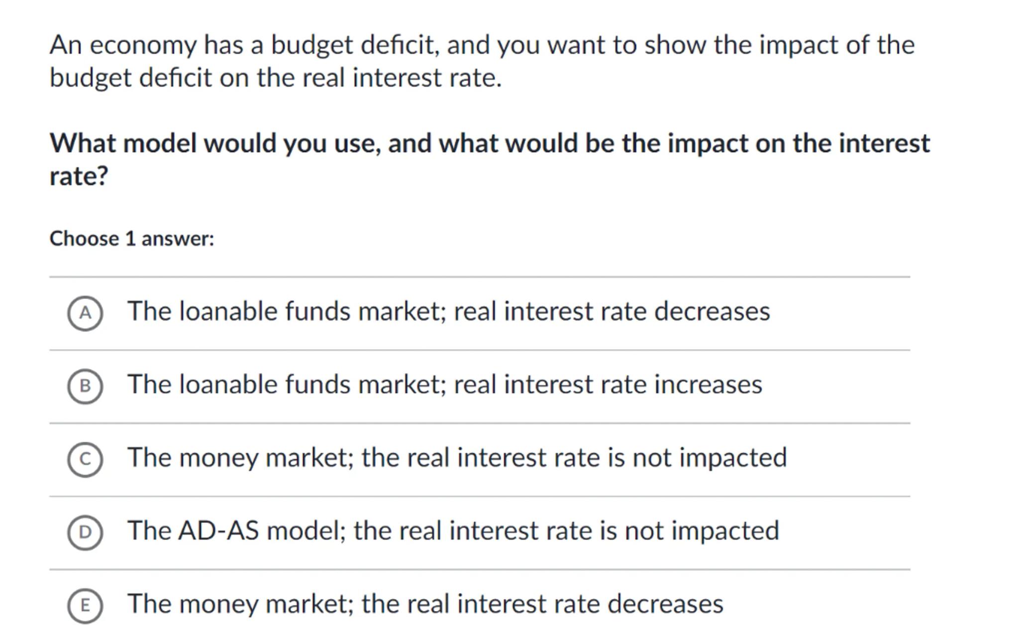 An economy has a budget deficit, and you want to show the impact of the budget deficit on the real interest rate.