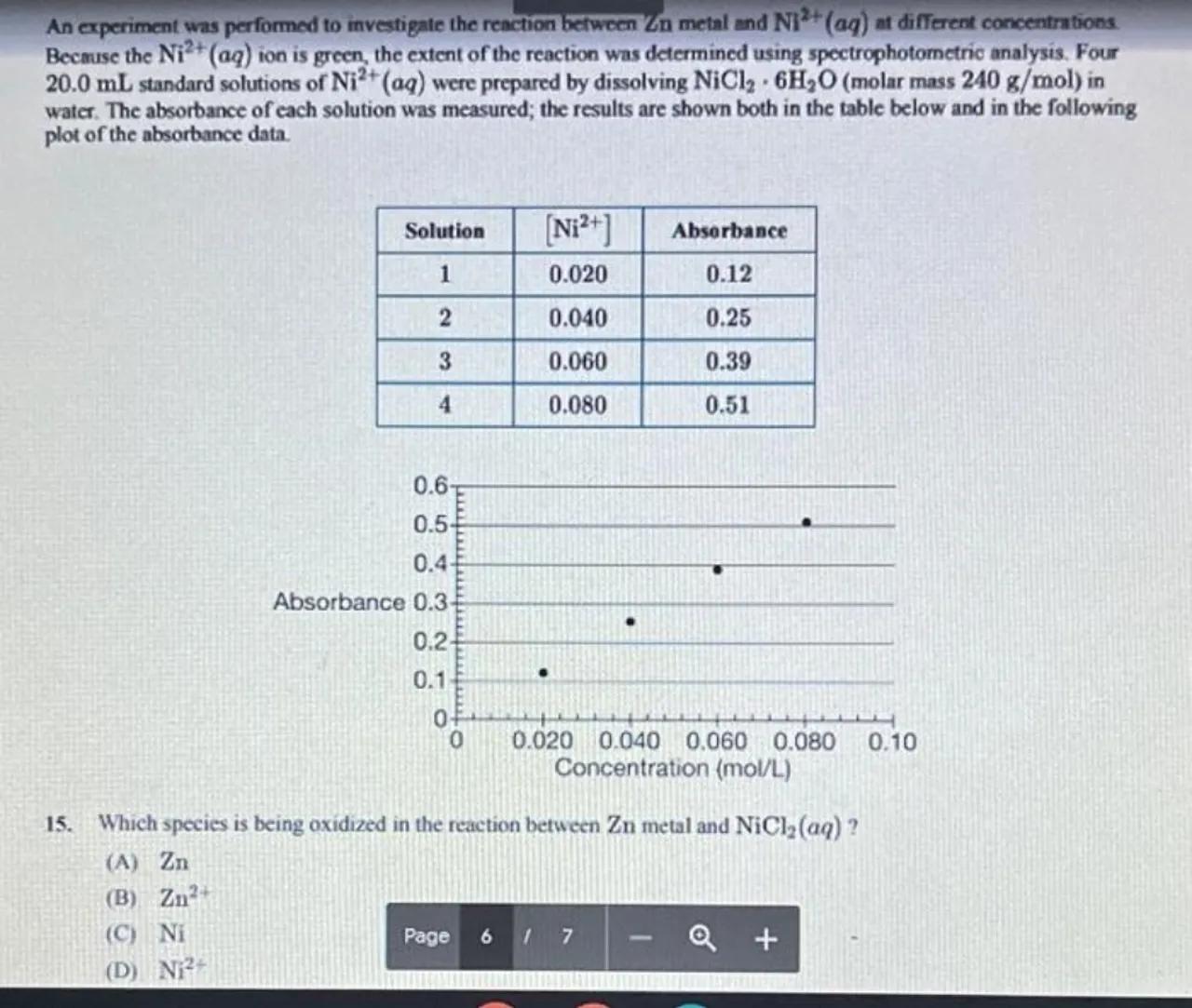 An experiment was performed to investigate the reaction between metal and at different concentrations. Because the ion is green, the extent of the reaction was determined using spectrophotometric analysis. Four standard solutions of were prepared by dissolving (molar mass ) in water. The absorbance of each solution was measured; the results are shown both in the table below and in the following plot of the absorbance data.