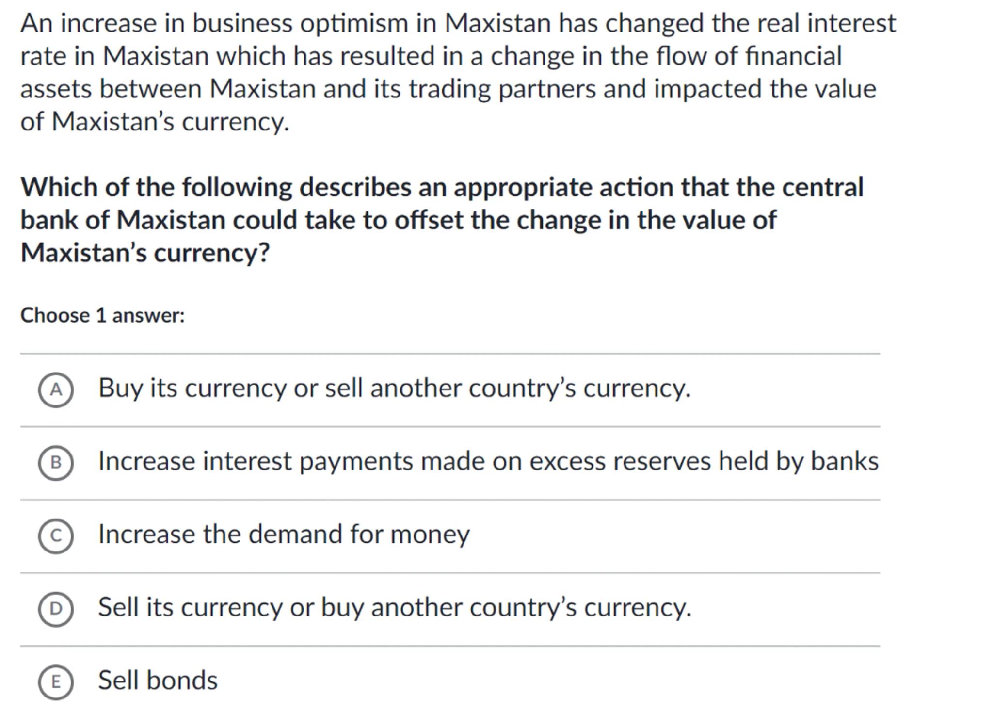 Which of the following describes an appropriate action that the central bank of Maxistan could take to offset the change in the value of Maxistan's currency?