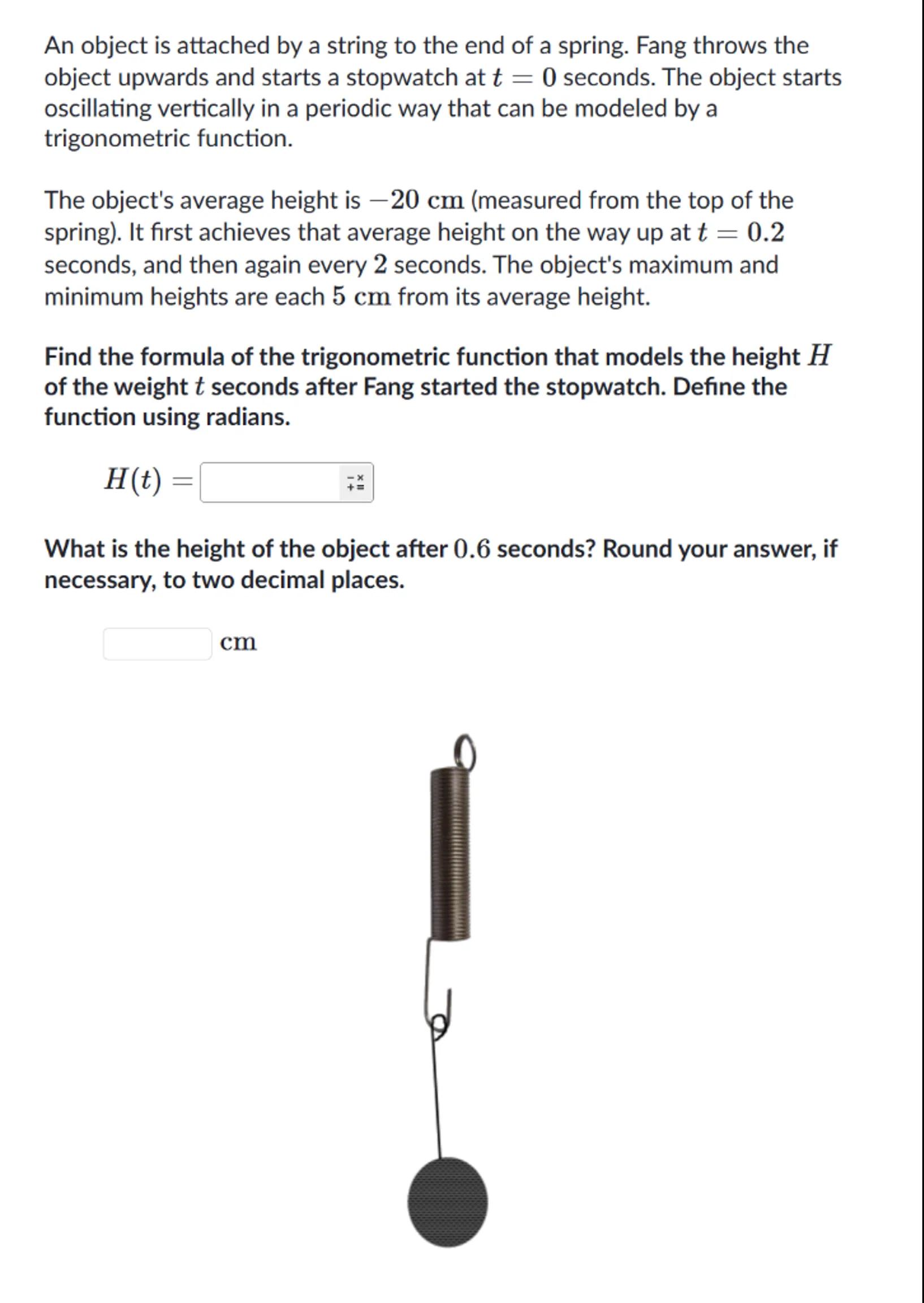 An object is attached by a string to the end of a spring. Fang throws the object upwards and starts a stopwatch at seconds. The object starts oscillating vertically in a periodic way that can be modeled by a trigonometric function.