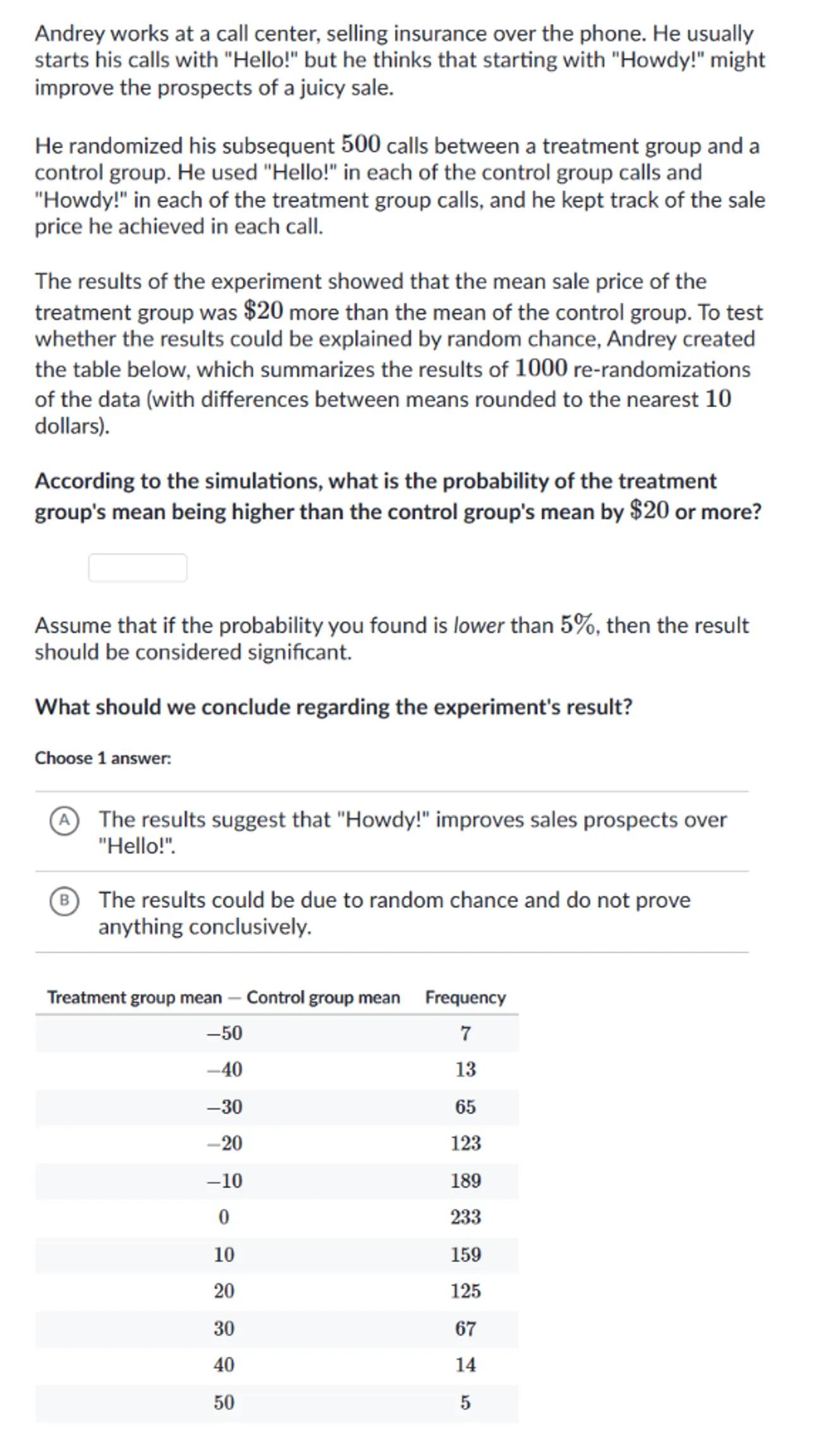 He randomized his subsequent 500 calls between a treatment group and a control group. He used "Hello!" in each of the control group calls and "Howdy!" in each of the treatment group calls, and he kept track of the sale price he achieved in each call.