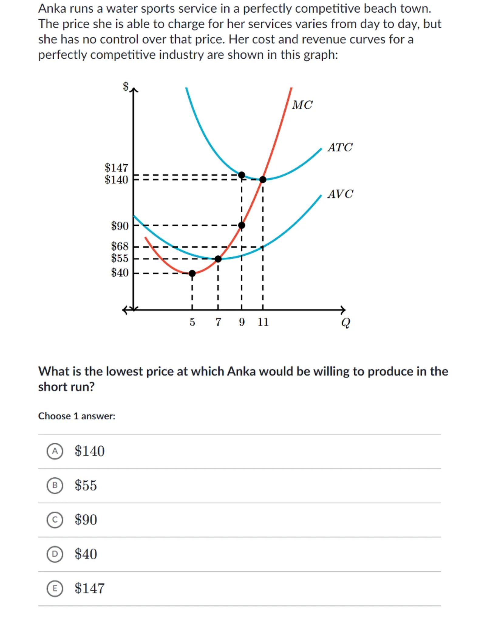 Anka runs a water sports service in a perfectly competitive beach town. The price she is able to charge for her services varies from day to day, but she has no control over that price. Her cost and revenue curves for a perfectly competitive industry are shown in this graph: