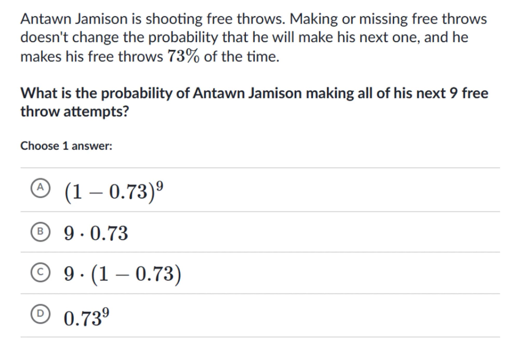 Antawn Jamison is shooting free throws. Making or missing free throws doesn't change the probability that he will make his next one, and he makes his free throws  of the time.