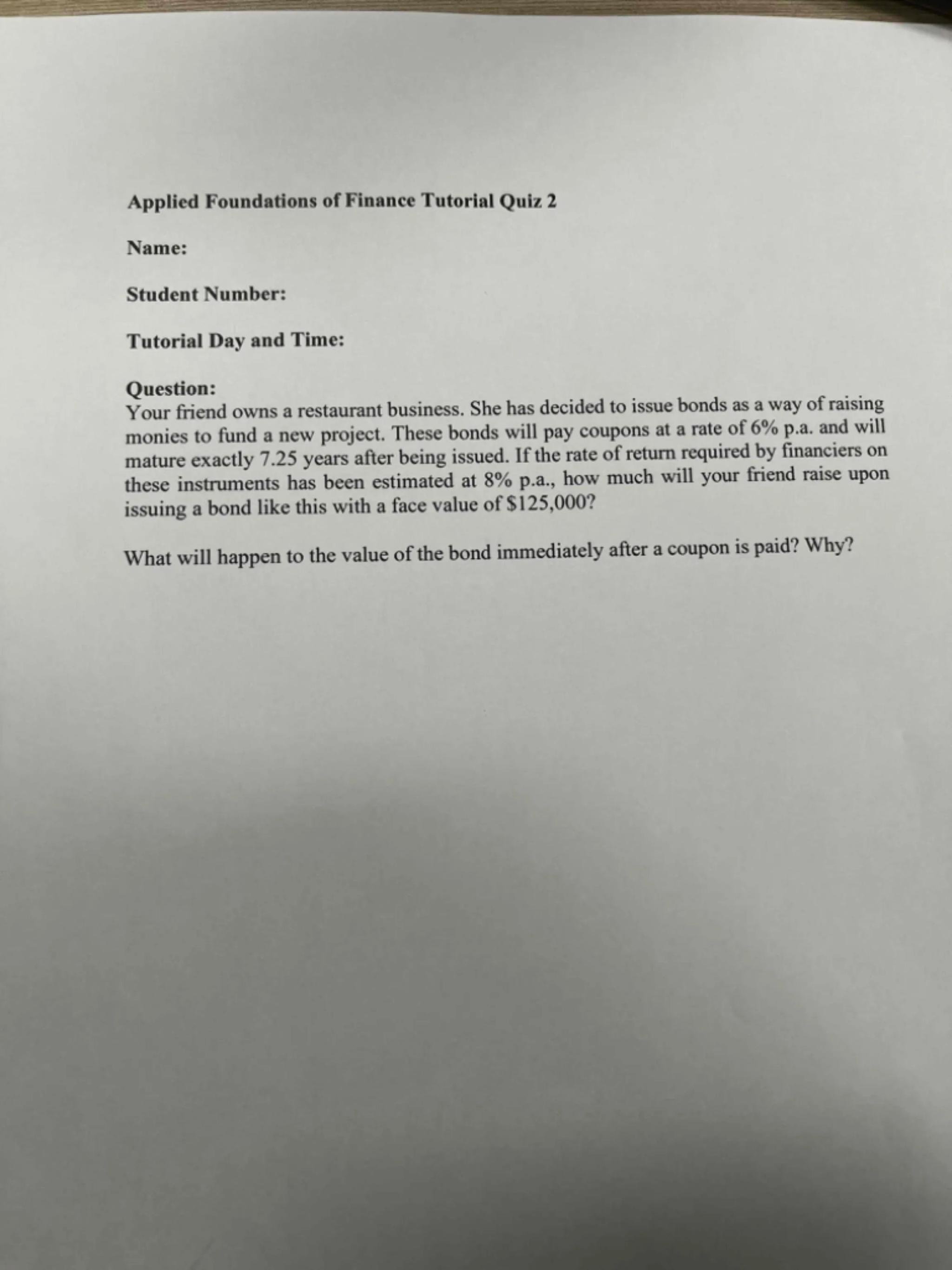 Your friend owns a restaurant business. She has decided to issue bonds as a way of raising monies to fund a new project. These bonds will pay coupons at a rate of p.a. and will mature exactly 7.25 years after being issued. If the rate of return required by financiers on these instruments has been estimated at p.a., how much will your friend raise upon issuing a bond like this with a face value of ?