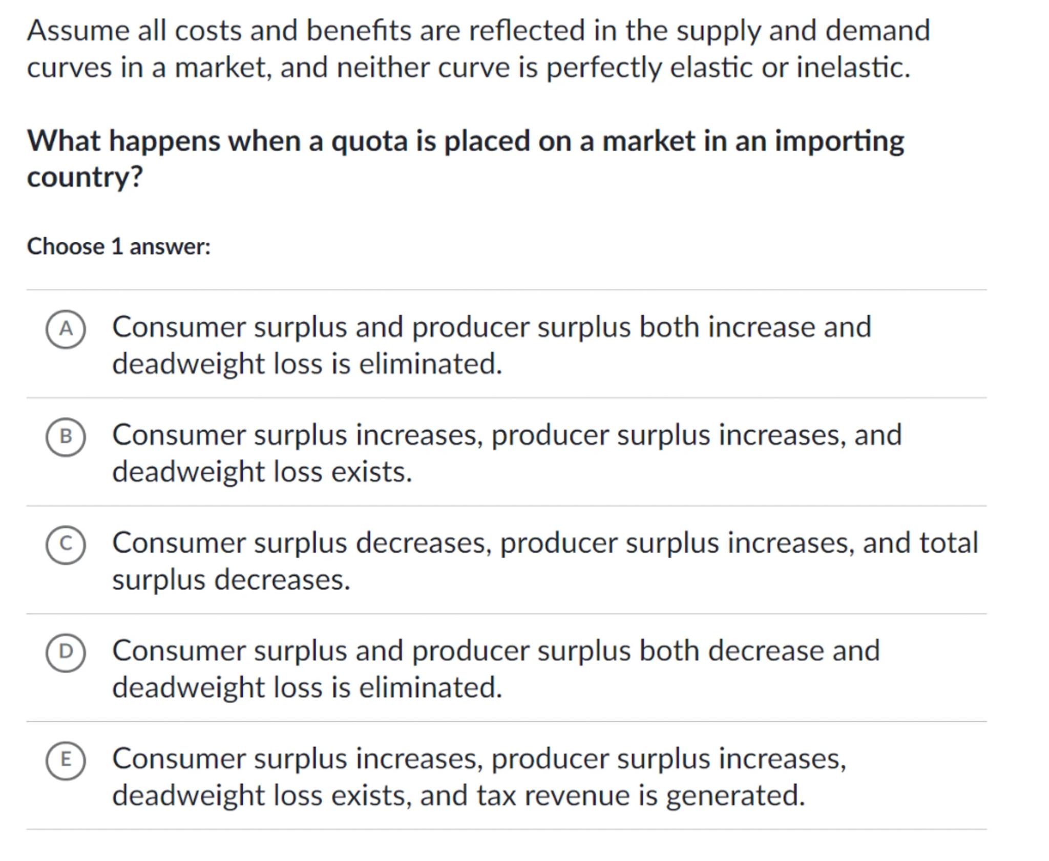 Assume all costs and benefits are reflected in the supply and demand curves in a market, and neither curve is perfectly elastic or inelastic.
