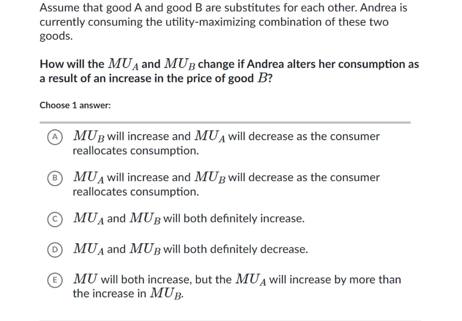 Assume that good and good are substitutes for each other. Andrea is currently consuming the utility-maximizing combination of these two goods.