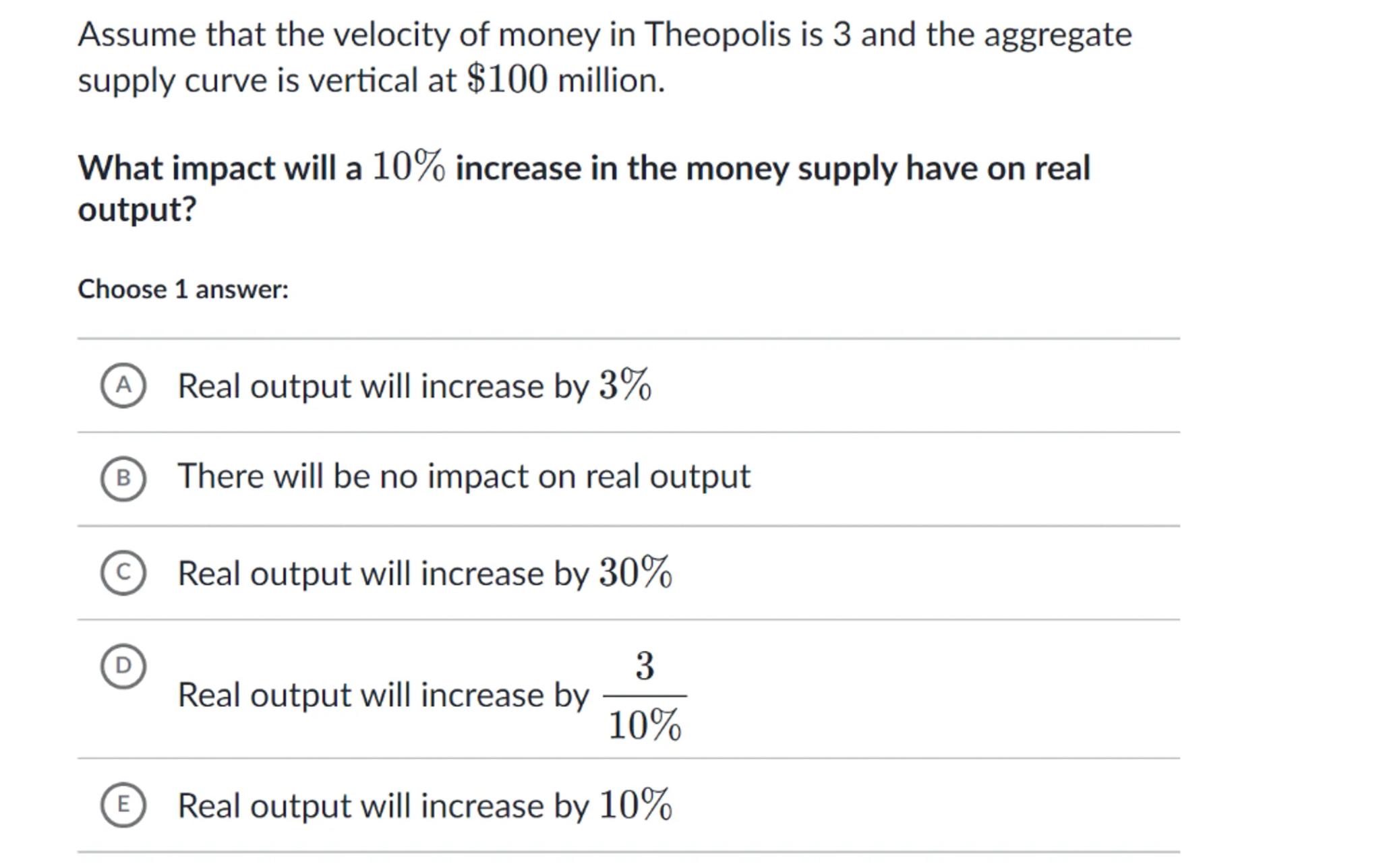 Assume that the velocity of money in Theopolis is 3 and the aggregate supply curve is vertical at million.