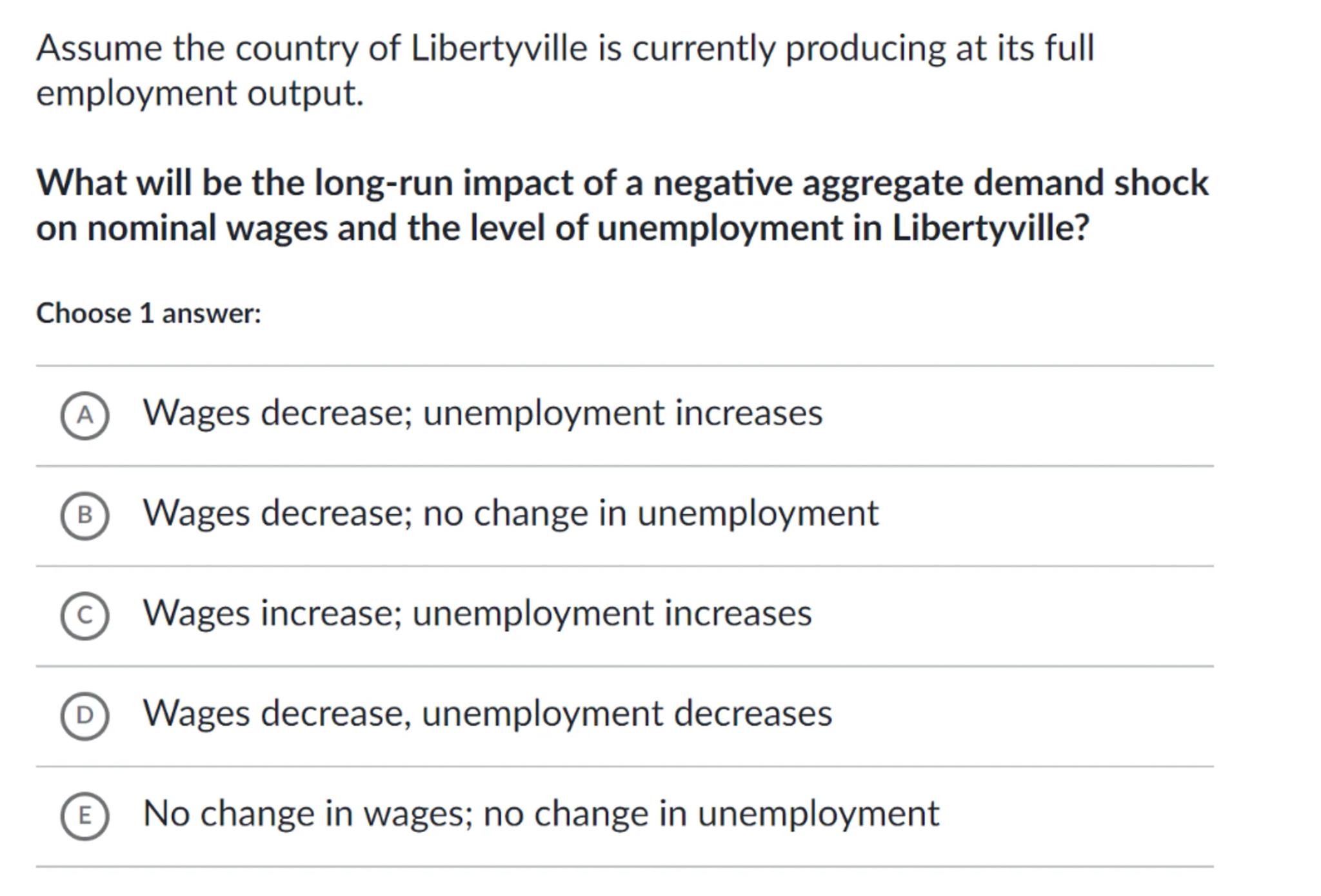 What will be the long-run impact of a negative aggregate demand shock on nominal wages and the level of unemployment in Libertyville?