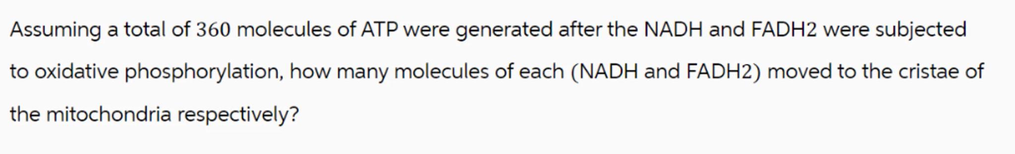 Assuming a total of 360 molecules of ATP were generated after the NADH and FADH2 were subjected to oxidative phosphorylation, how many molecules of each (NADH and FADH2) moved to the cristae of the mitochondria respectively?