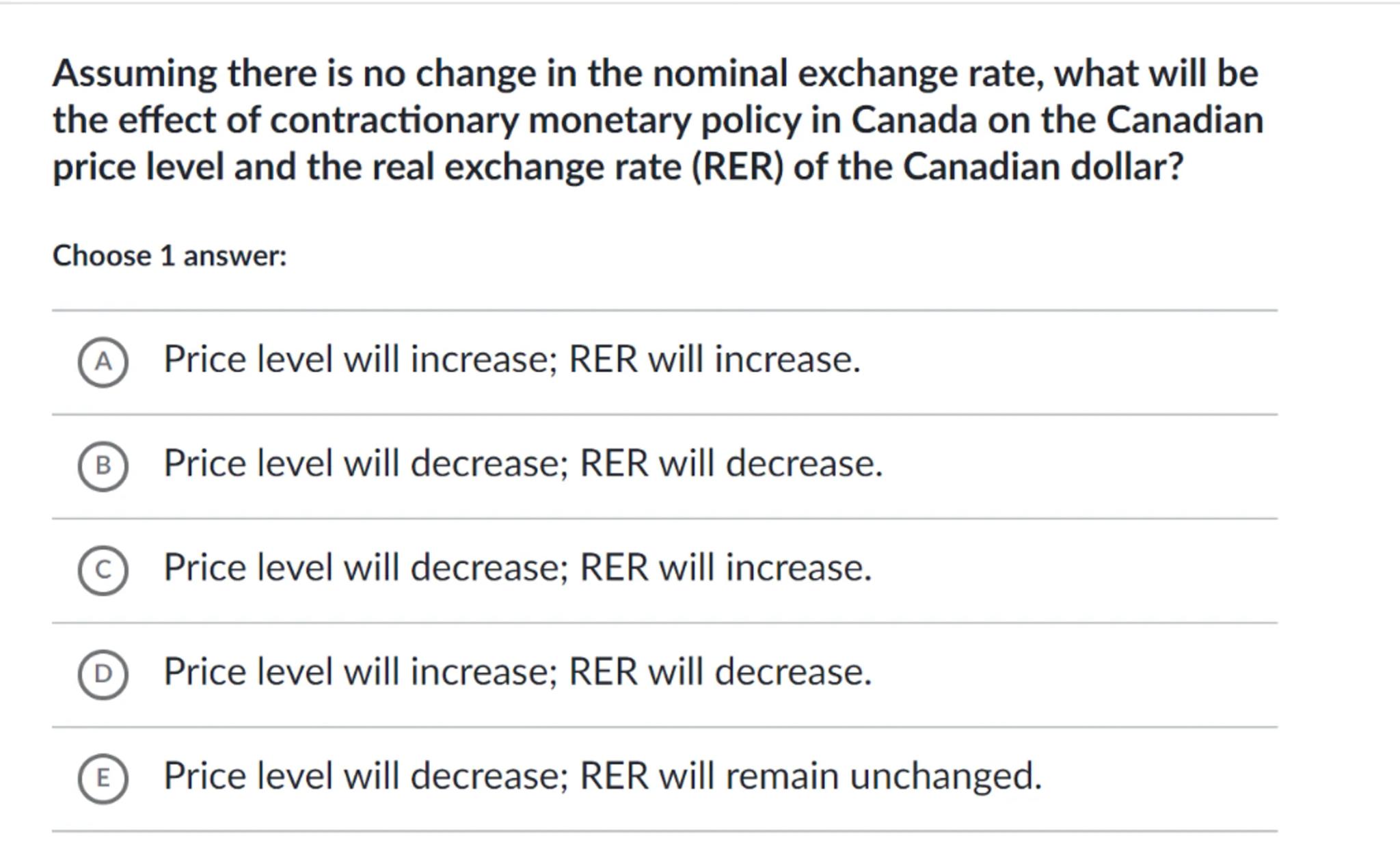 Assuming there is no change in the nominal exchange rate, what will be the effect of contractionary monetary policy in Canada on the Canadian price level and the real exchange rate (RER) of the Canadian dollar?