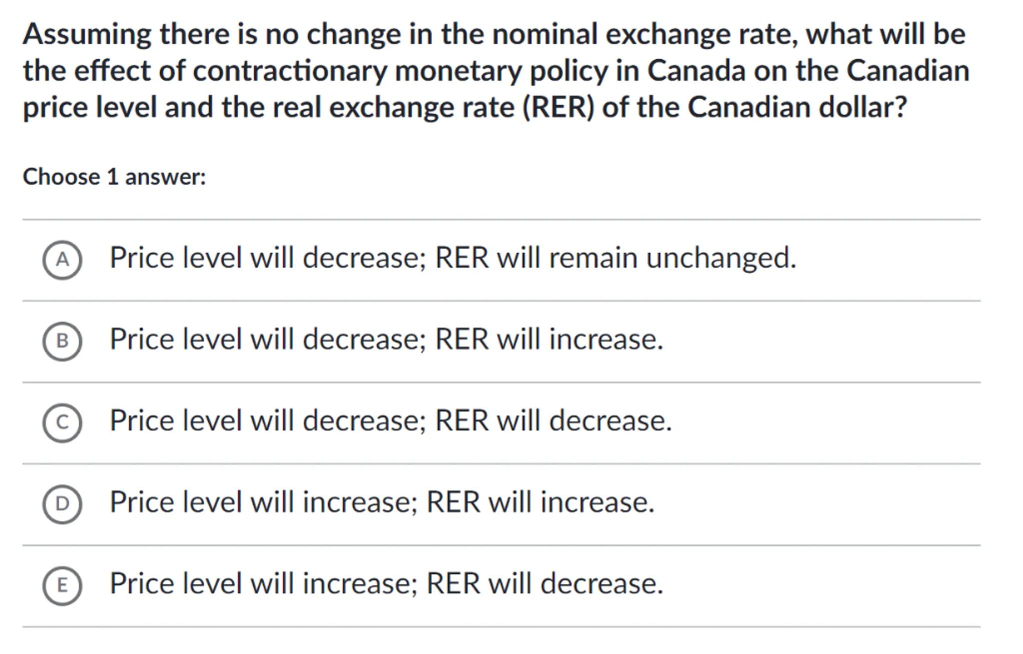 Assuming there is no change in the nominal exchange rate, what will be the effect of contractionary monetary policy in Canada on the Canadian price level and the real exchange rate (RER) of the Canadian dollar?