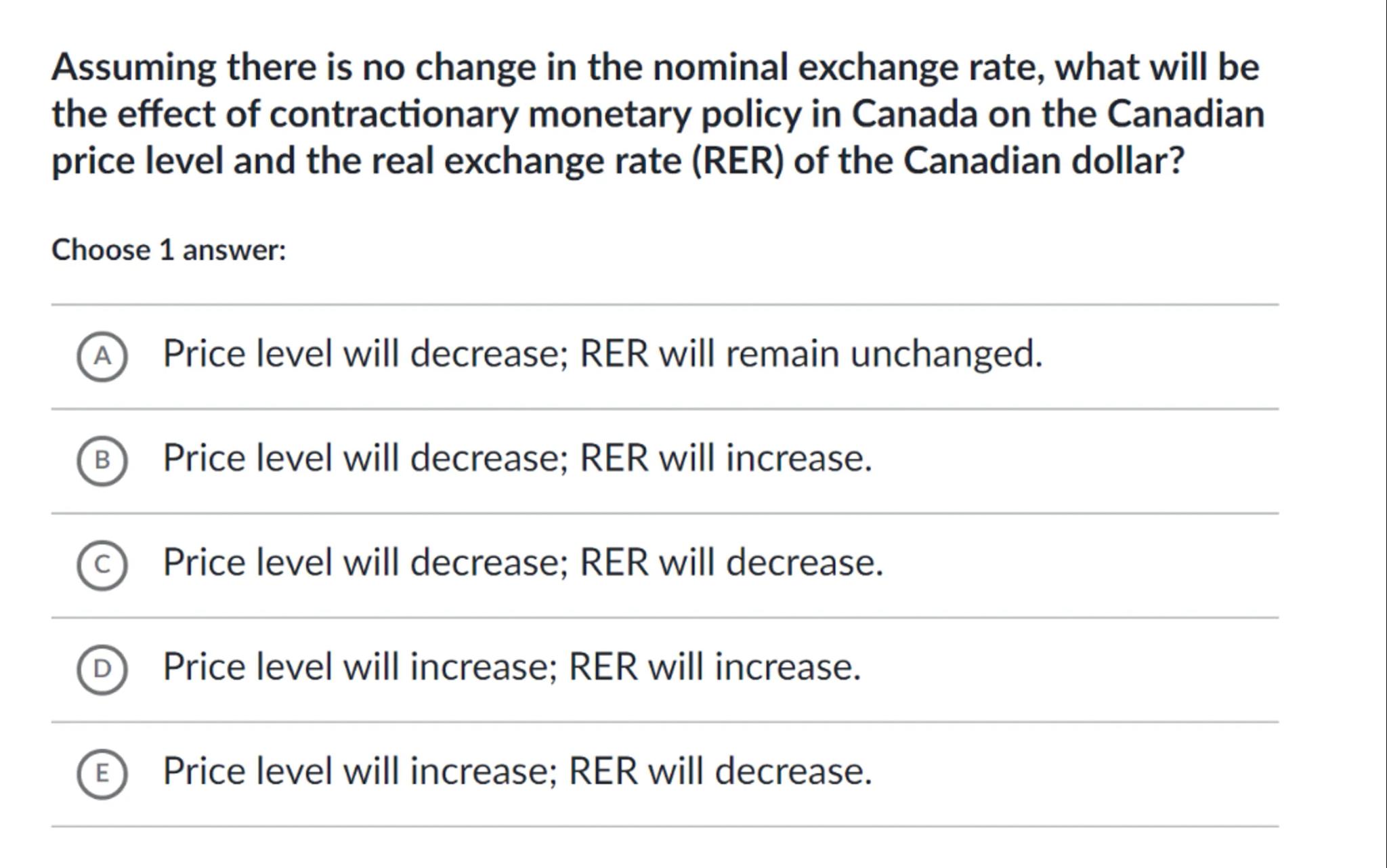 Assuming there is no change in the nominal exchange rate, what will be the effect of contractionary monetary policy in Canada on the Canadian price level and the real exchange rate (RER) of the Canadian dollar?