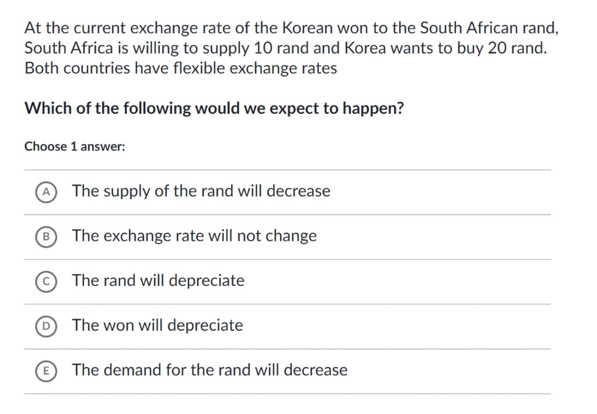 At the current exchange rate of the Korean won to the South African rand, South Africa is willing to supply 10 rand and Korea wants to buy 20 rand. Both countries have flexible exchange rates