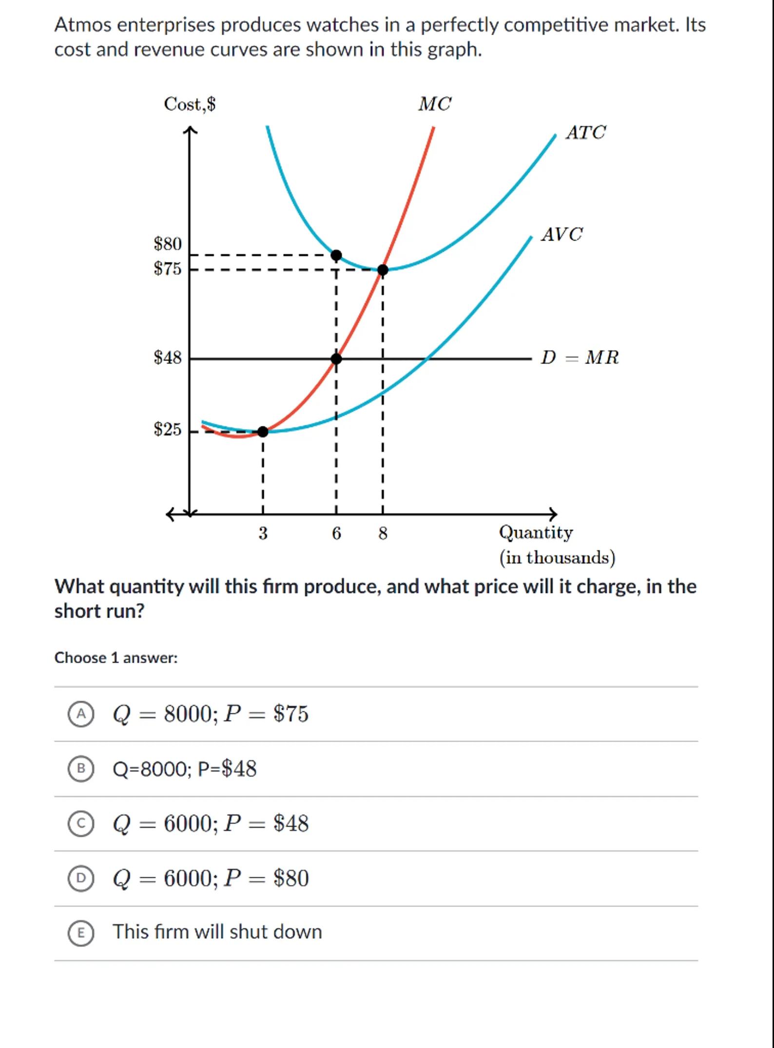 Atmos enterprises produces watches in a perfectly competitive market. Its cost and revenue curves are shown in this graph.