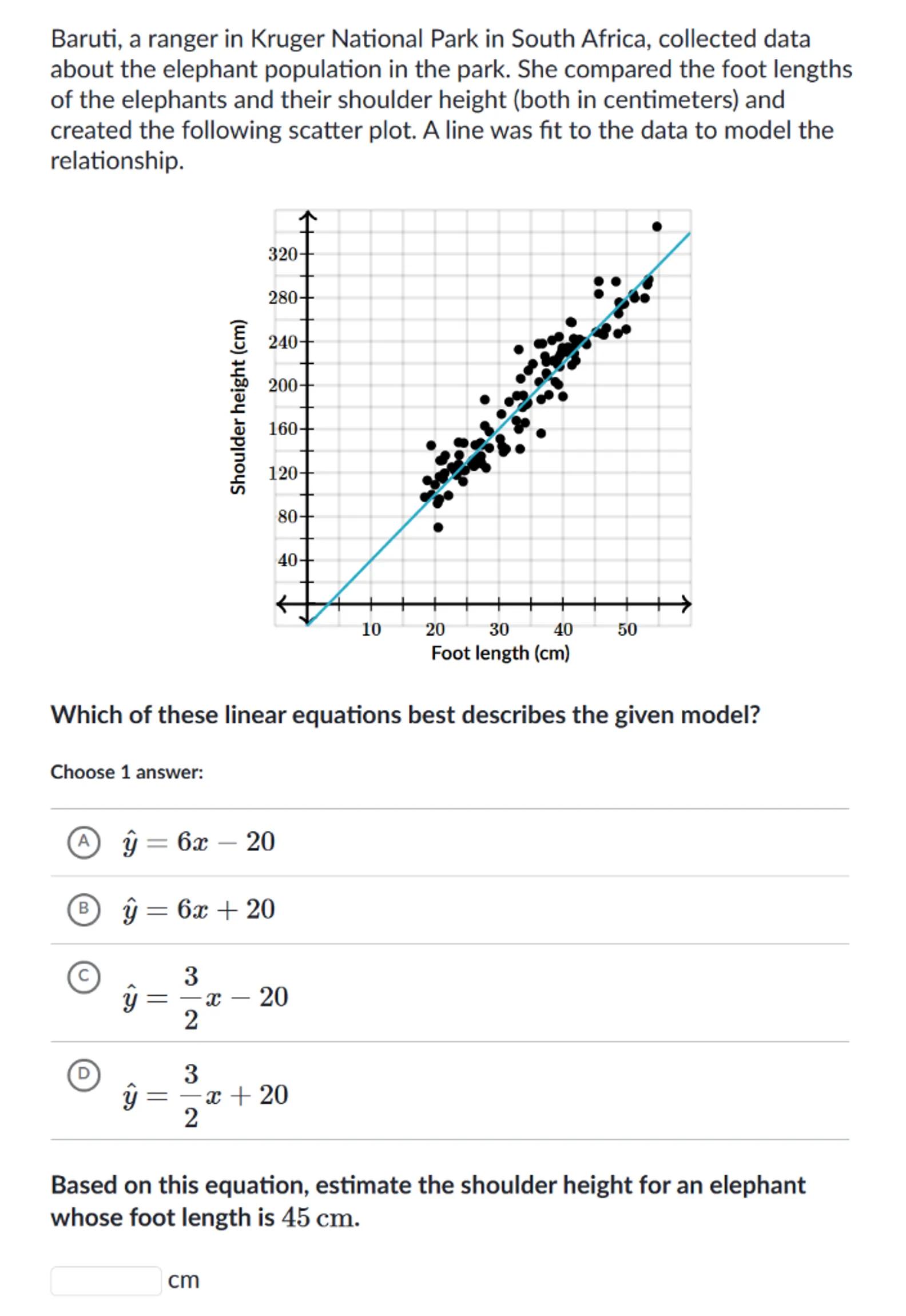 Baruti, a ranger in Kruger National Park in South Africa, collected data about the elephant population in the park. She compared the foot lengths of the elephants and their shoulder height (both in centimeters) and created the following scatter plot. A line was fit to the data to model the relationship.
