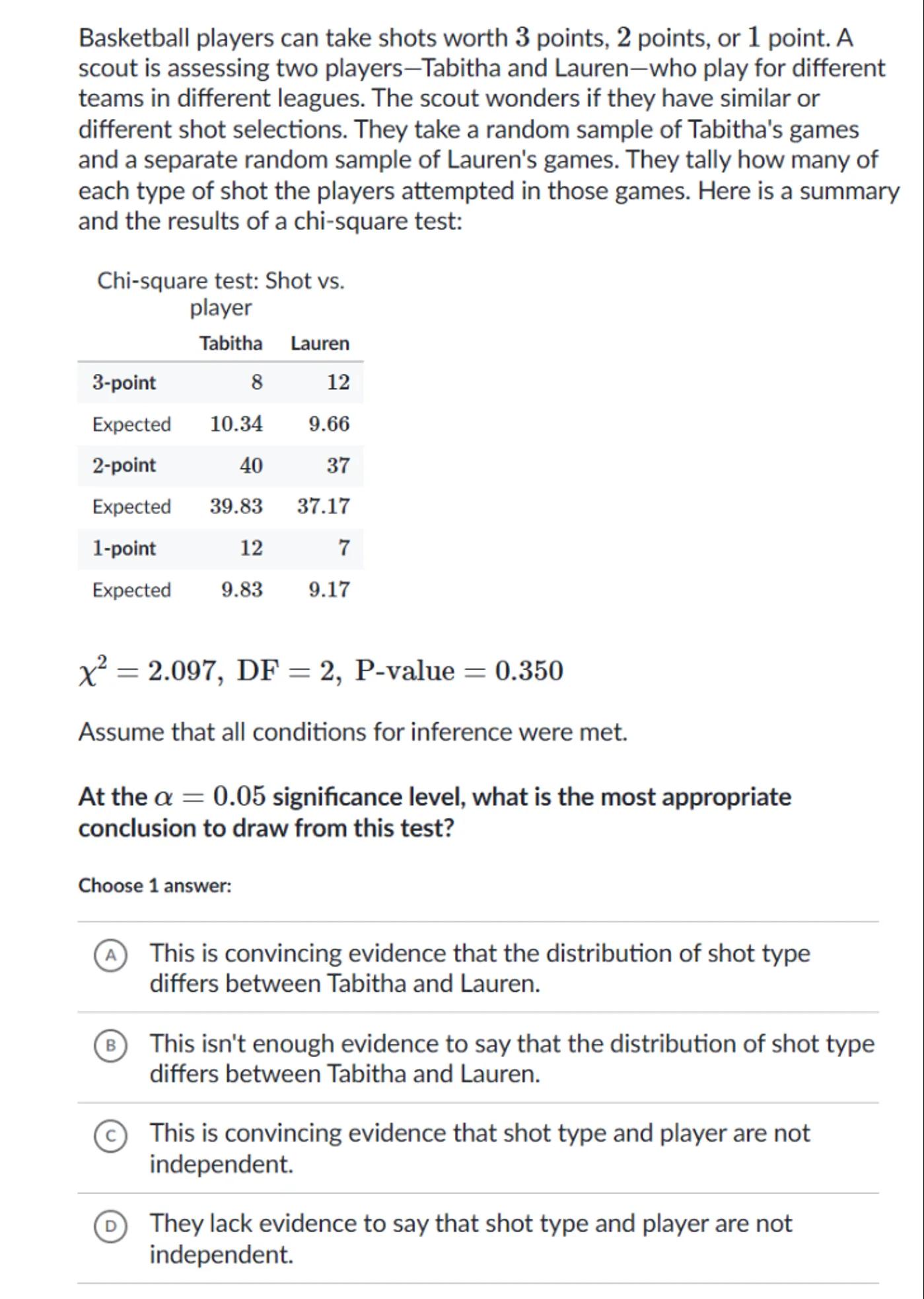 Basketball players can take shots worth 3 points, 2 points, or 1 point. A scout is assessing two players-Tabitha and Lauren-who play for different teams in different leagues. The scout wonders if they have similar or different shot selections. They take a random sample of Tabitha's games and a separate random sample of Lauren's games. They tally how many of each type of shot the players attempted in those games. Here is a summary and the results of a chi-square test: