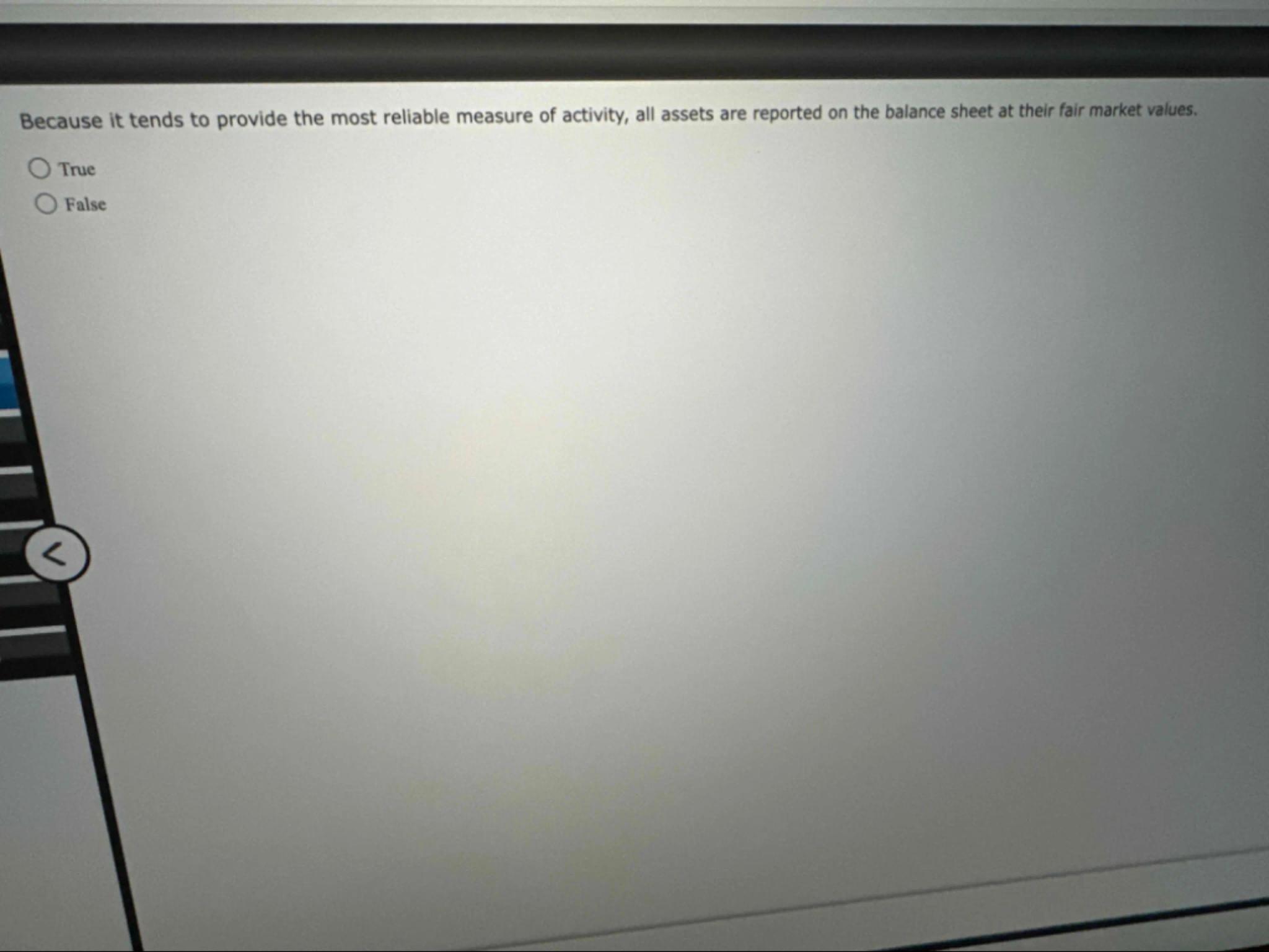 Based on the information provided by the OCR model, the statement that all assets are reported on the balance sheet at their fair market values because it provides the most reliable measure of activity is False. In accounting principles, assets are typically reported on the balance sheet at historical cost rather than fair market values. This is done to ensure consistency and reliability in financial reporting. If assets were reported at fair market values, it could lead to fluctuations in reported values based on market conditions, which may not accurately reflect the financial position of theNot the question you are looking for? Ask here!