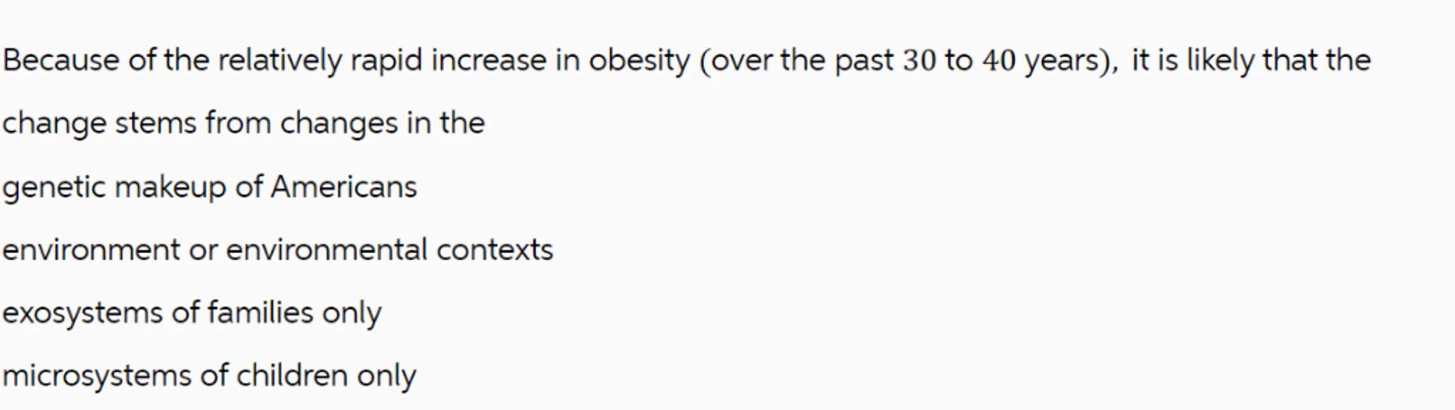 Because of the relatively rapid increase in obesity (over the past 30 to 40 years), it is likely that the change stems from changes in the