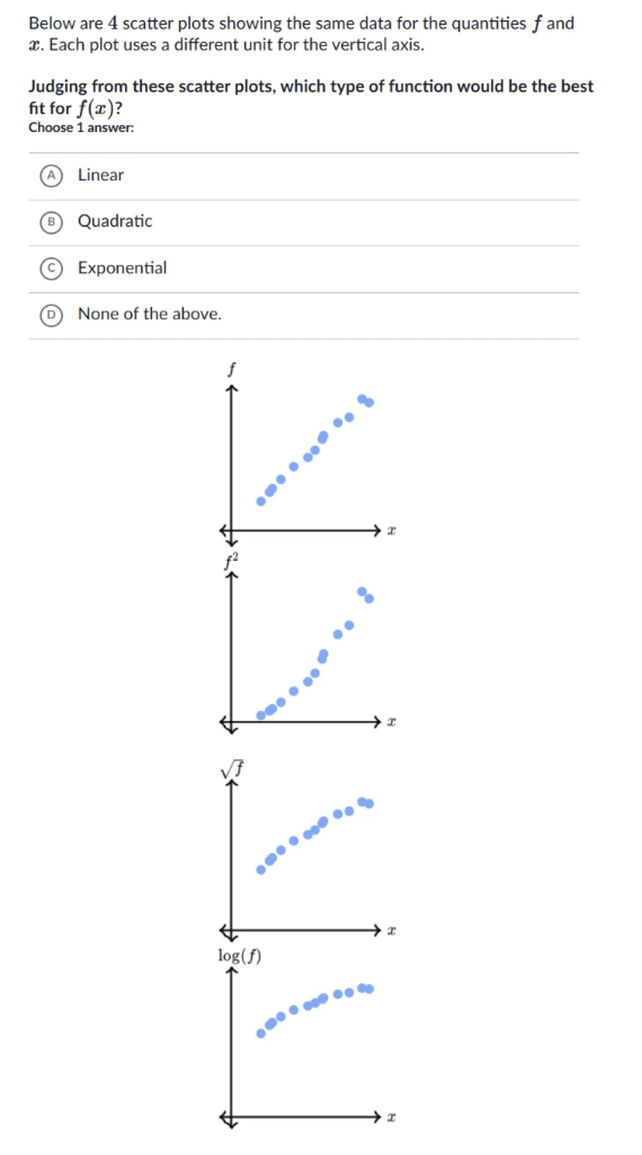 Judging from these scatter plots, which type of function would be the best fit for ?