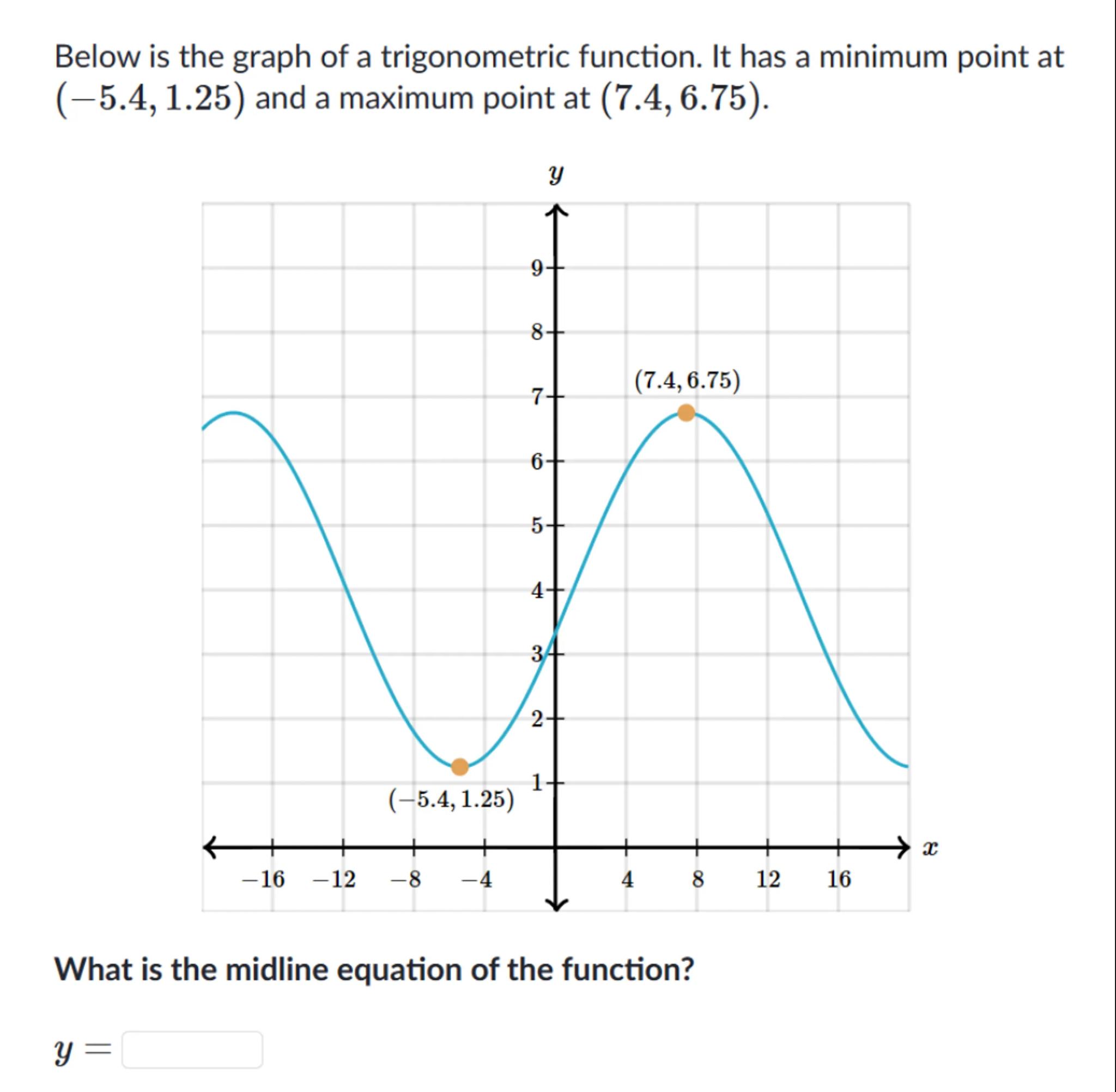Below is the graph of a trigonometric function. It has a minimum point at and a maximum point at .