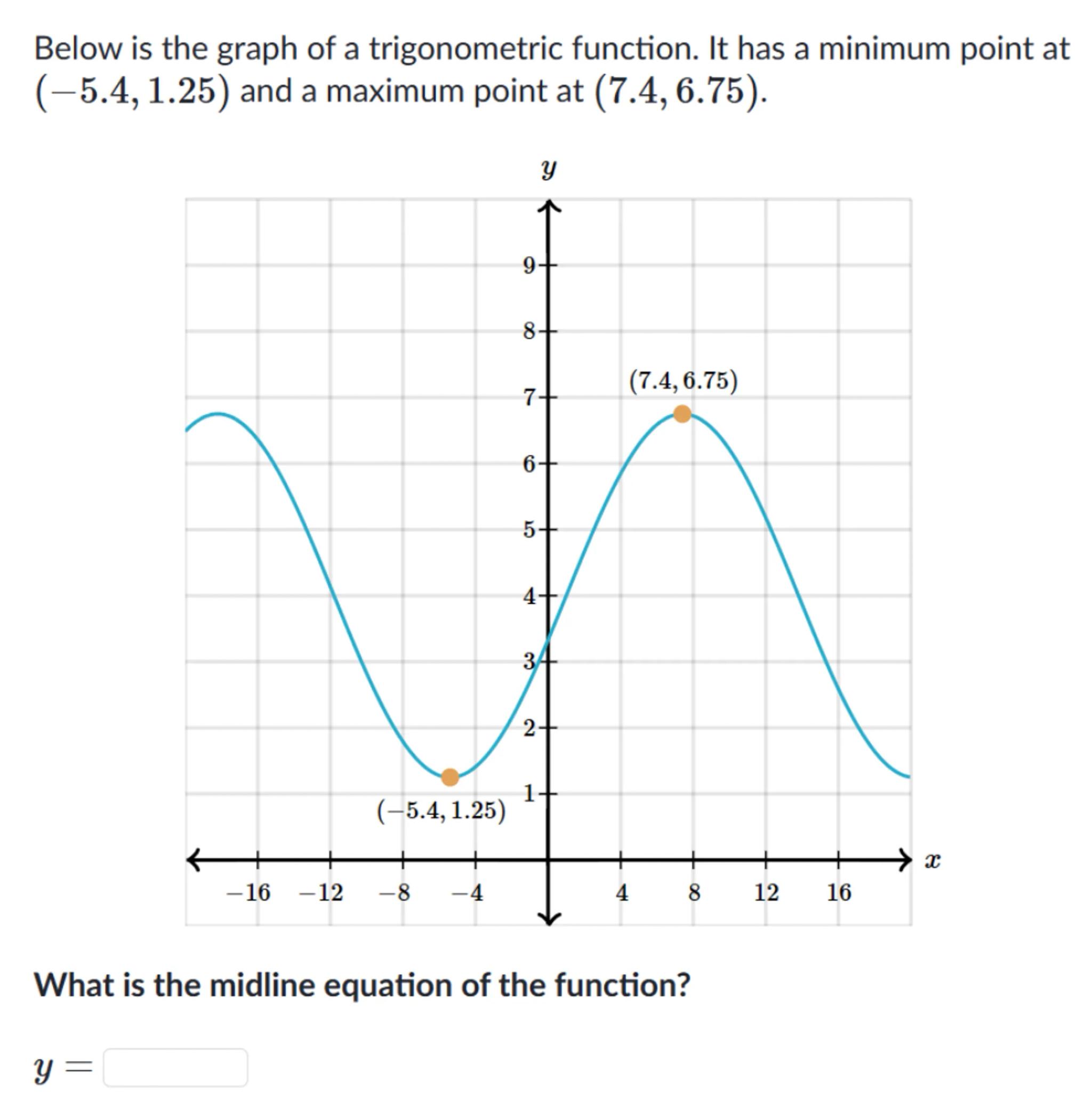 Below is the graph of a trigonometric function. It has a minimum point at and a maximum point at .