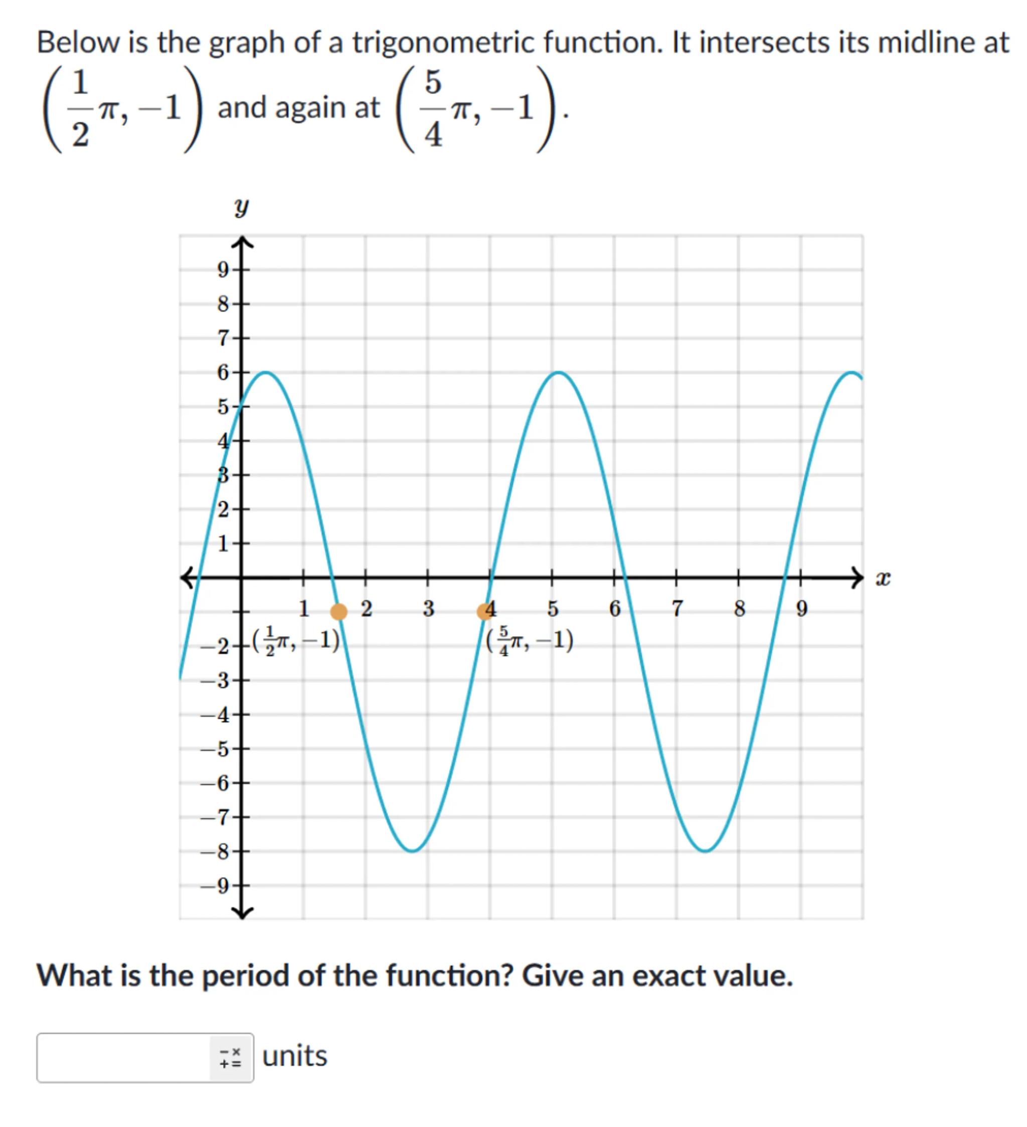 Below is the graph of a trigonometric function. It intersects its midline at and again at .