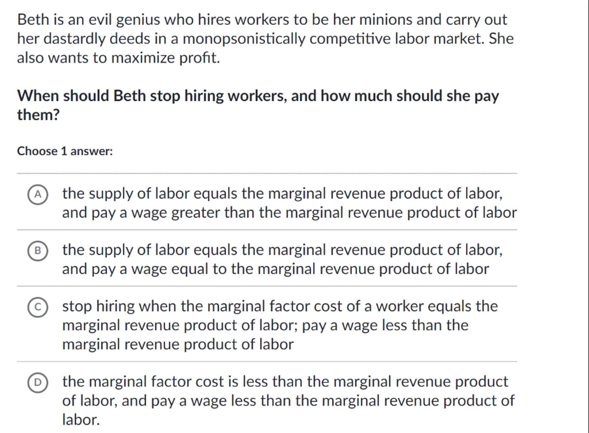 Beth is an evil genius who hires workers to be her minions and carry out her dastardly deeds in a monopsonistically competitive labor market. She also wants to maximize profit.