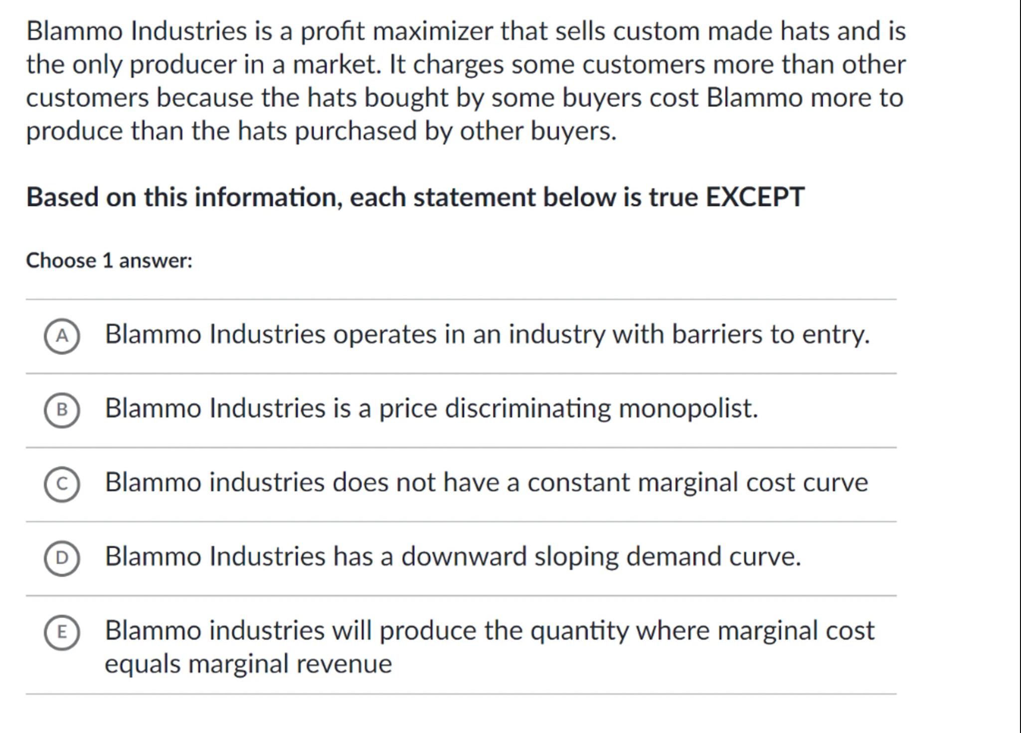 Blammo Industries is a profit maximizer that sells custom made hats and is the only producer in a market. It charges some customers more than other customers because the hats bought by some buyers cost Blammo more to produce than the hats purchased by other buyers.