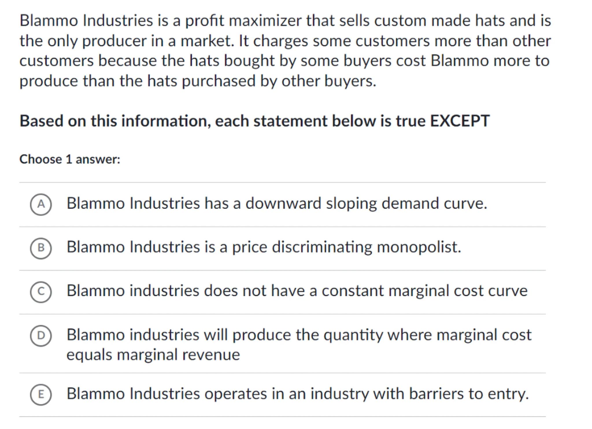 Blammo Industries is a profit maximizer that sells custom made hats and is the only producer in a market. It charges some customers more than other customers because the hats bought by some buyers cost Blammo more to produce than the hats purchased by other buyers.