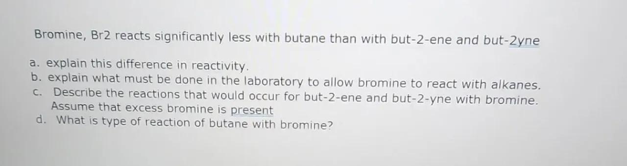 Bromine, Br2 reacts significantly less with butane than with but-2-ene and but-2yne