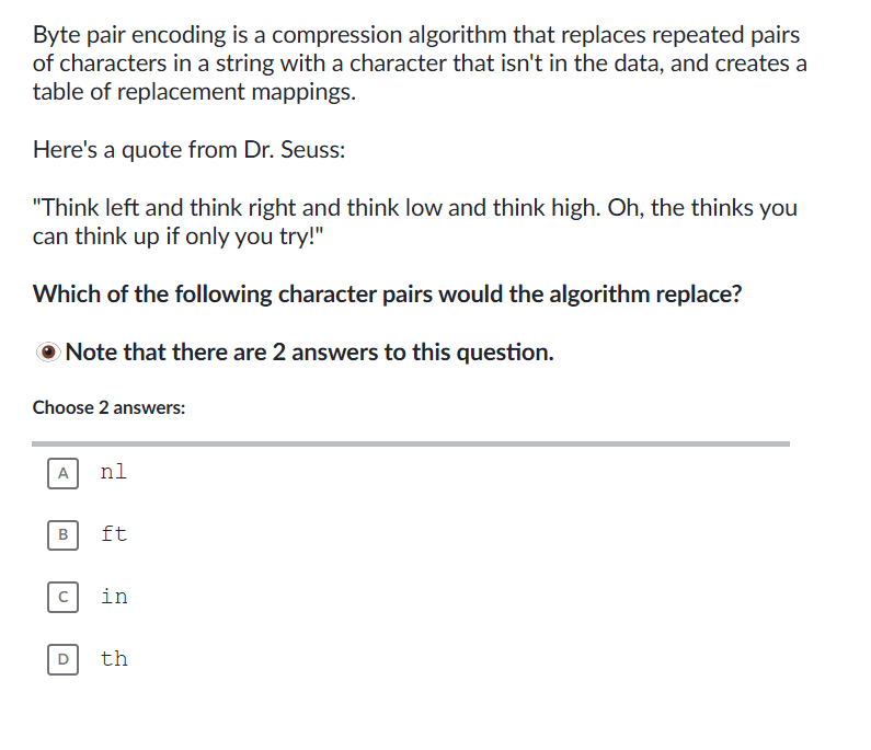 For the given question about Byte Pair Encoding and identifying which character pairs would be replaced, the correct answers are: