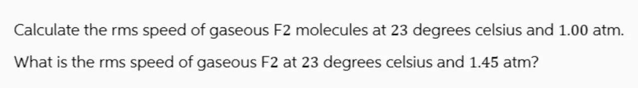 Calculate the rms speed of gaseous F2 molecules at 23 degrees celsius and . What is the rms speed of gaseous F2 at 23 degrees celsius and ?