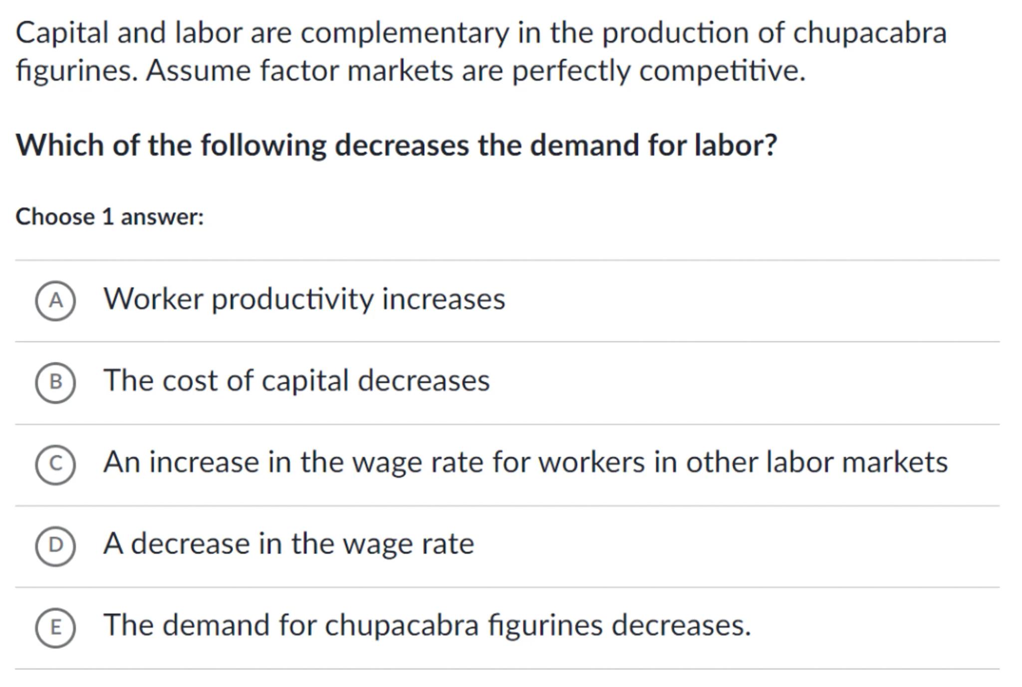 Capital and labor are complementary in the production of chupacabra figurines. Assume factor markets are perfectly competitive.
