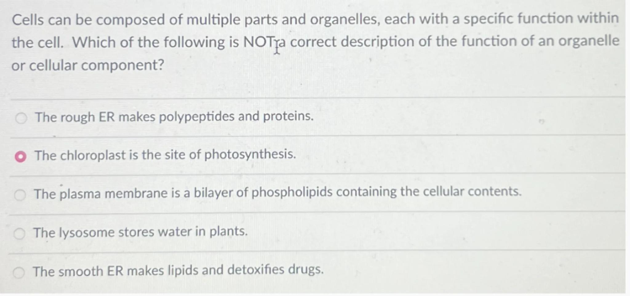 Cells can be composed of multiple parts and organelles, each with a specific function within the cell. Which of the following is NOTra correct description of the function of an organelle or cellular component?
