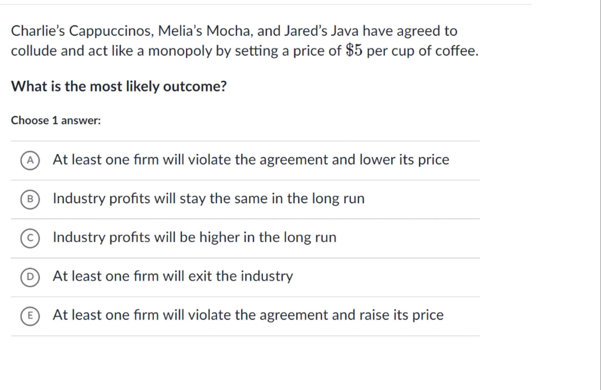Charlie's Cappuccinos, Melia's Mocha, and Jared's Java have agreed to collude and act like a monopoly by setting a price of per cup of coffee.
