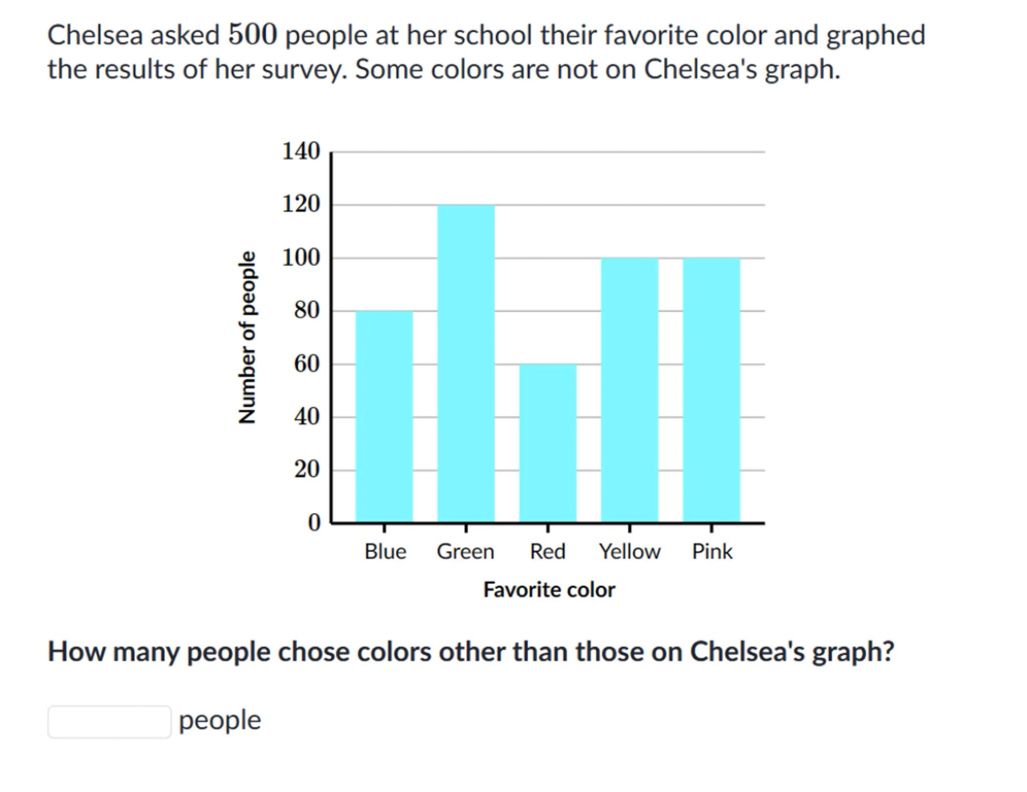 Chelsea asked 500 people at her school their favorite color and graphed the results of her survey. Some colors are not on Chelsea's graph.
