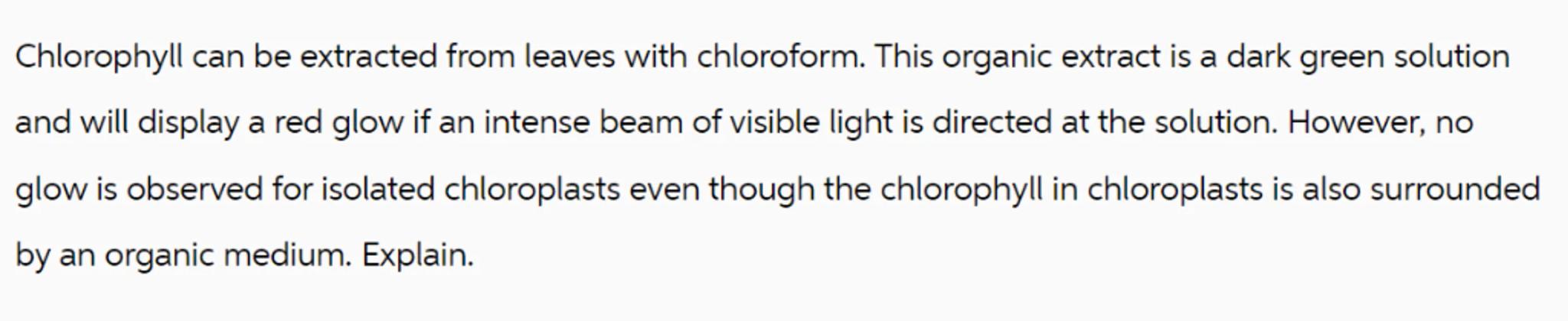 Chlorophyll can be extracted from leaves with chloroform. This organic extract is a dark green solution and will display a red glow if an intense beam of visible light is directed at the solution. However, no glow is observed for isolated chloroplasts even though the chlorophyll in chloroplasts is also surrounded by an organic medium. Explain.
