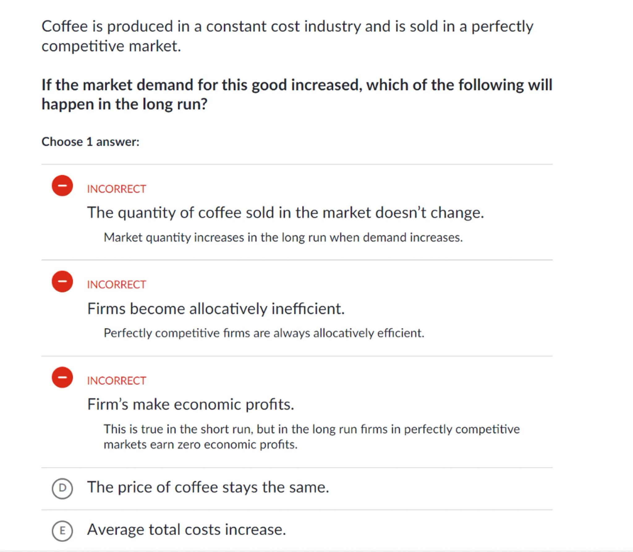 Coffee is produced in a constant cost industry and is sold in a perfectly competitive market.