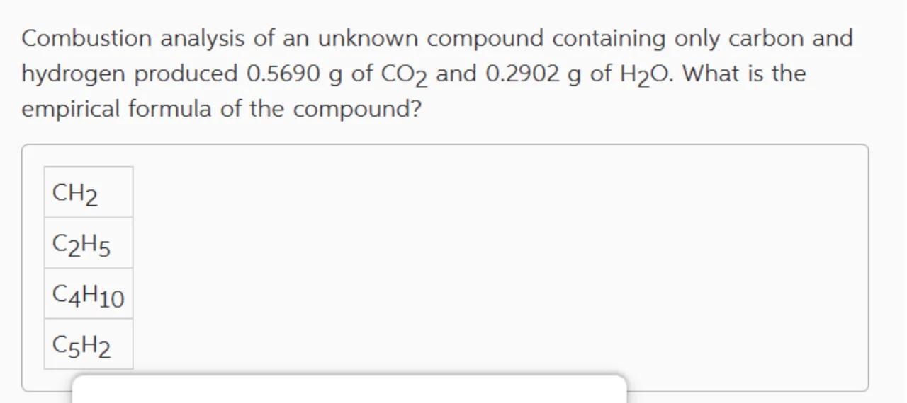 Combustion analysis of an unknown compound containing only carbon and hydrogen produced of and of . What is the empirical formula of the compound?