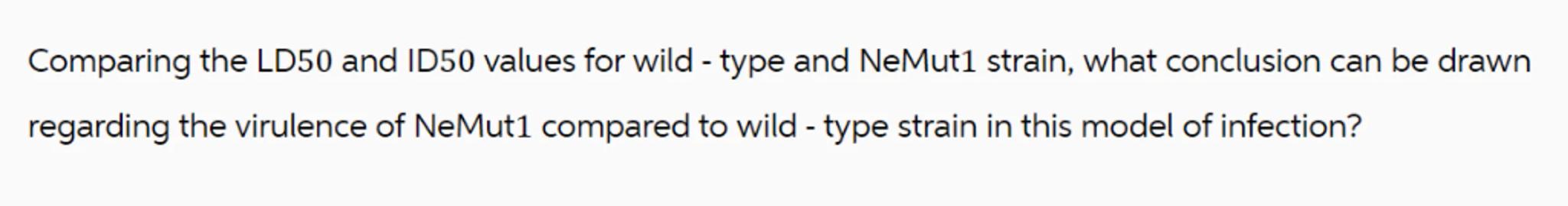 Comparing the LD50 and ID50 values for wild - type and NeMut1 strain, what conclusion can be drawn regarding the virulence of NeMut1 compared to wild - type strain in this model of infection?