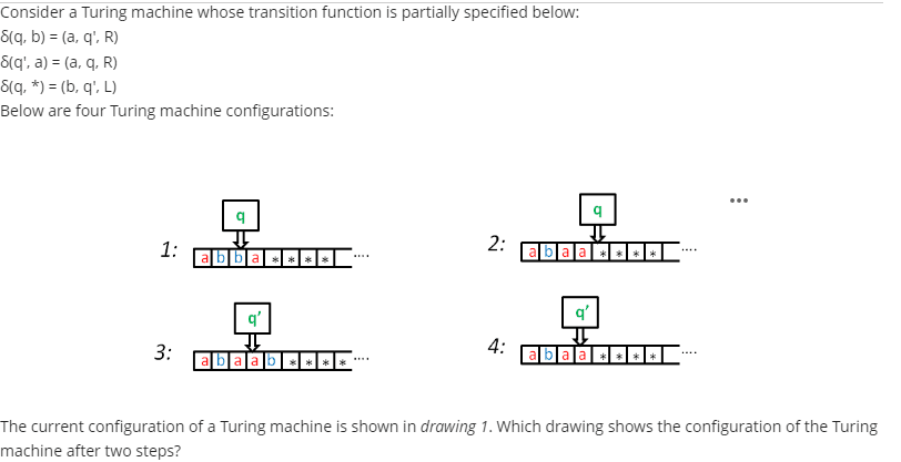 The current configuration of a Turing machine is shown in drawing 1. Which drawing shows the configuration of the Turing
