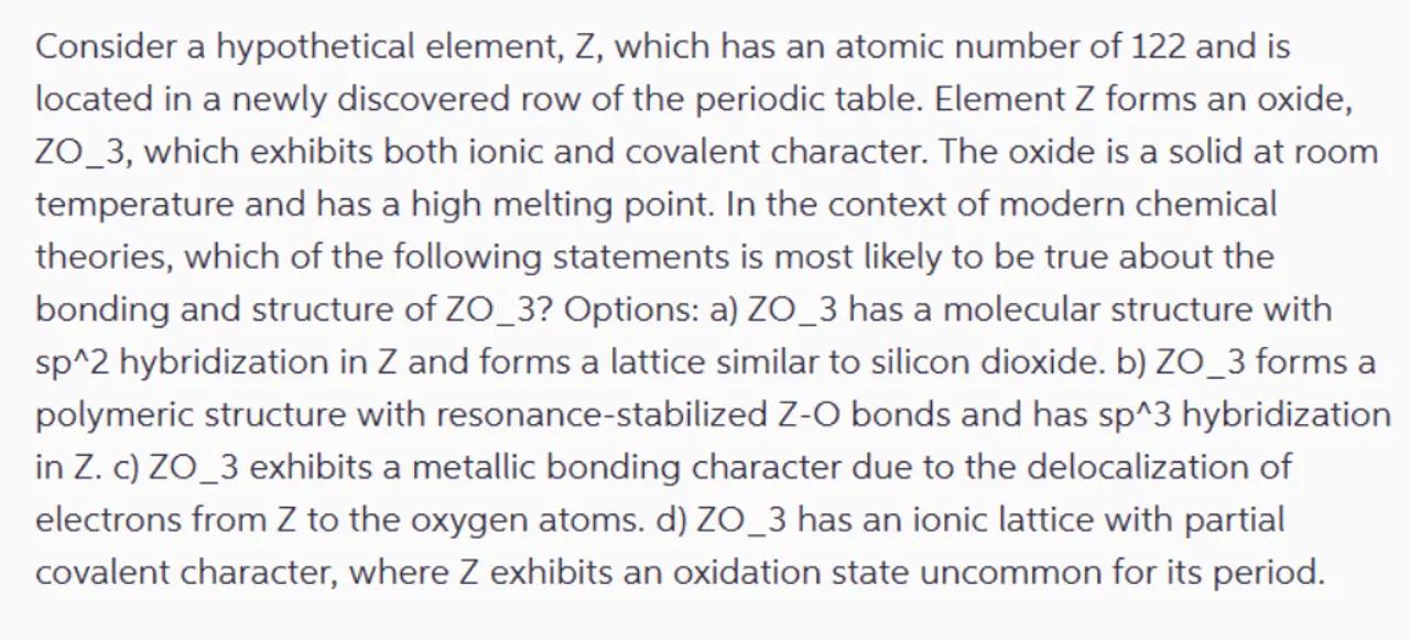 Consider a hypothetical element, Z, which has an atomic number of 122 and is located in a newly discovered row of the periodic table. Element forms an oxide, ZO_3, which exhibits both ionic and covalent character. The oxide is a solid at room temperature and has a high melting point. In the context of modern chemical theories, which of the following statements is most likely to be true about the bonding and structure of ZO_3? Options: a) ZO_3 has a molecular structure with hybridization in and forms a lattice similar to silicon dioxide. b) ZO_3 forms a polymeric structure with resonance-stabilized Z-O bonds and has hybridization in Z. c) ZO_3 exhibits a metallic bonding character due to the delocalization of electrons from to the oxygen atoms. d) ZO_3 has an ionic lattice with partial covalent character, where exhibits an oxidation state uncommon for its period.