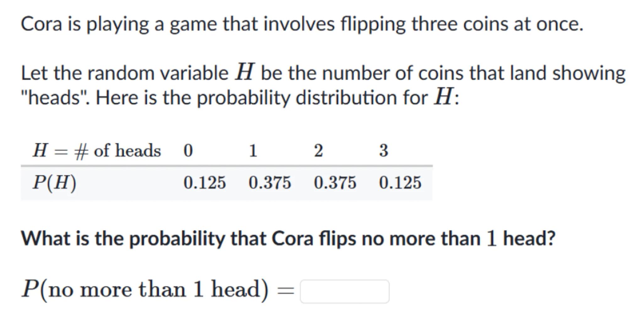 Let the random variable be the number of coins that land showing "heads". Here is the probability distribution for :