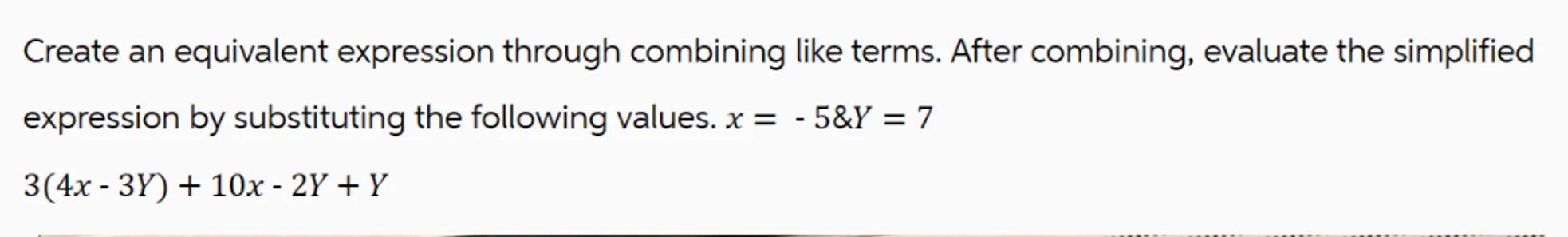 Create an equivalent expression through combining like terms. After combining, evaluate the simplified expression by substituting the following values.